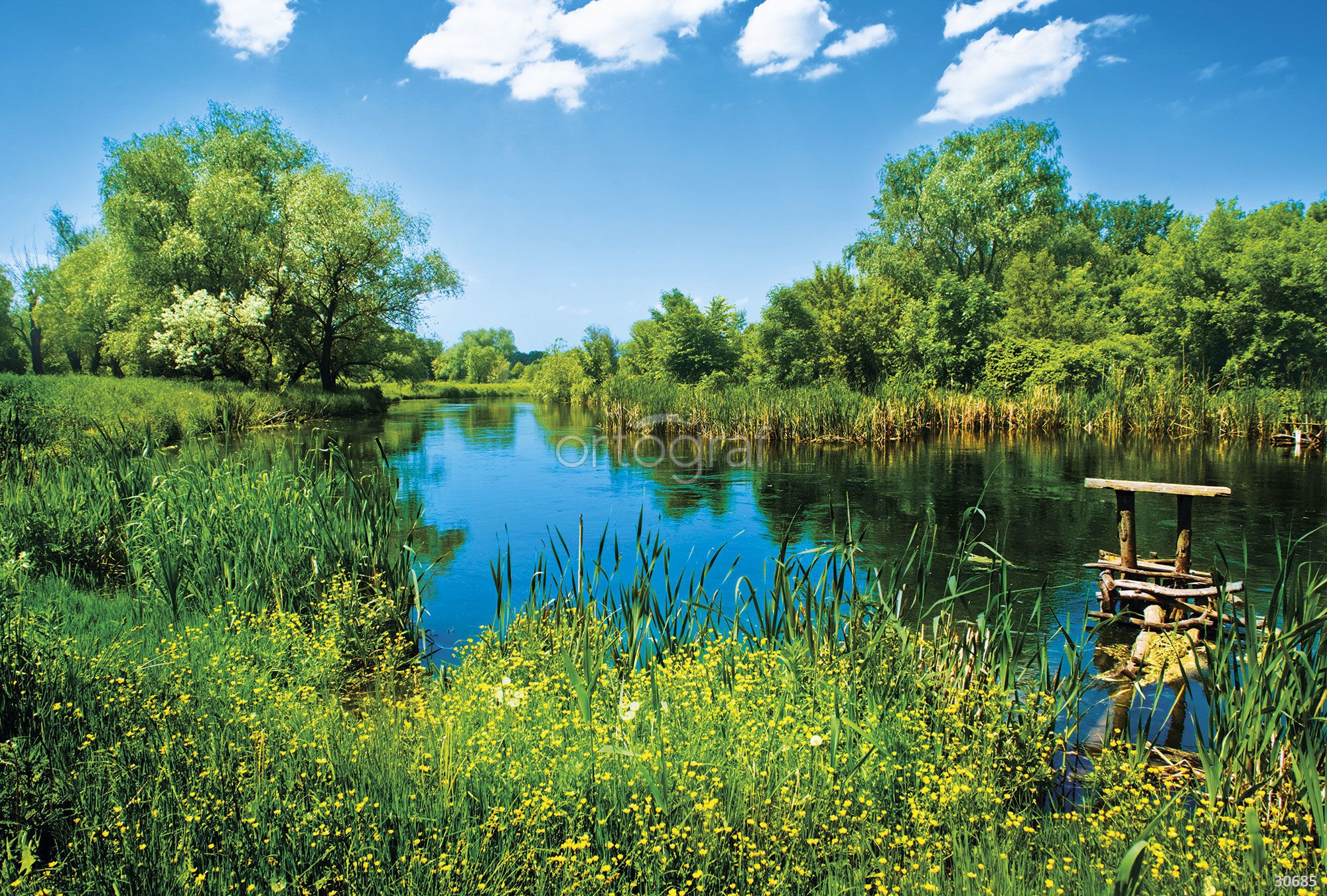 Пейзаж с рекой, цветущим лугом, густыми деревьями и небольшим деревянным мостиком создает атмосферу спокойствия и умиротворения, ассоциируется с летним отдыхом на природе и тишиной. Такое изображение хорошо помогает расслабиться и добавить уюта в интерьер, визуально расширяя пространство и наполняя его свежестью.