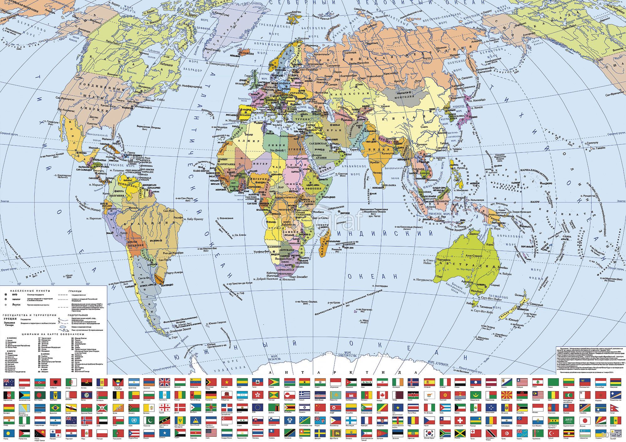 Детальная политическая карта мира с границами государств, столицами, географическими названиями и флагами всех стран в нижней части. Карта выполнена в ярких цветах, понятна для изучения и вдохновляет на изучение географии и путешествий.