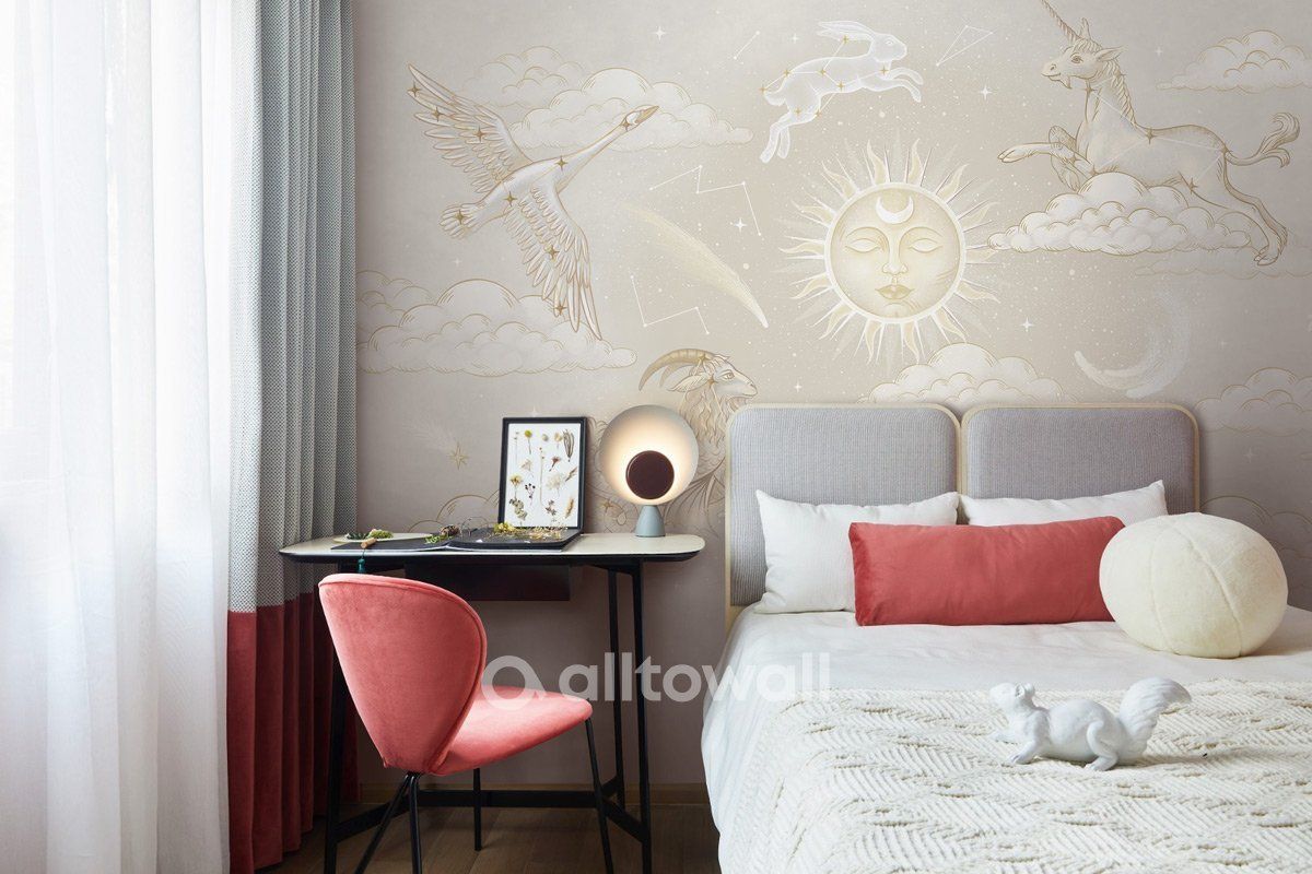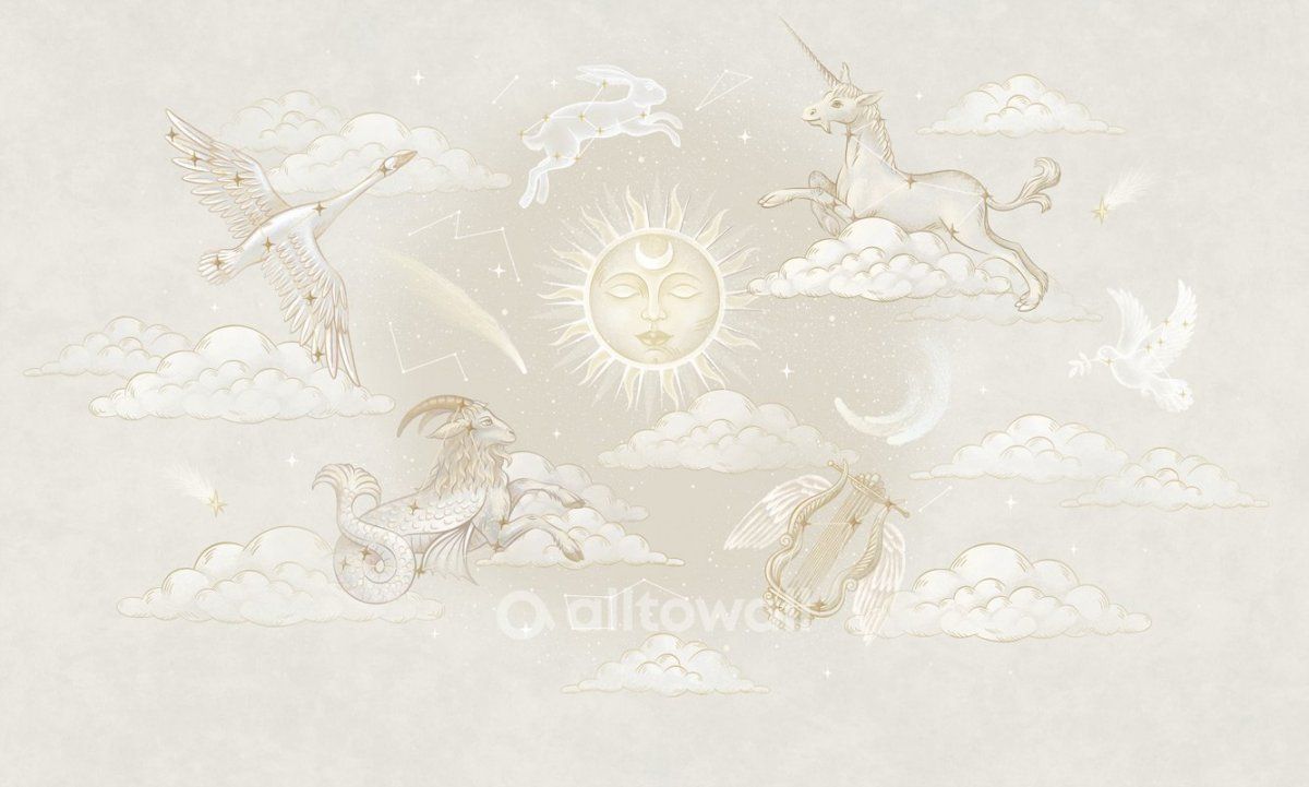 Знали ли вы, что созвездие Арфы по-настоящему существует? Мы создали принт, в котором вы найдёте как хорошо знакомые, так и редкие созвездия. «Созвездия зодиака-2» — это золотисто-песочные обои с изображением созвездий, комет, солнца и облаков. Такой сюжет может стать украшением детской девочки или комнаты разнополых детей.