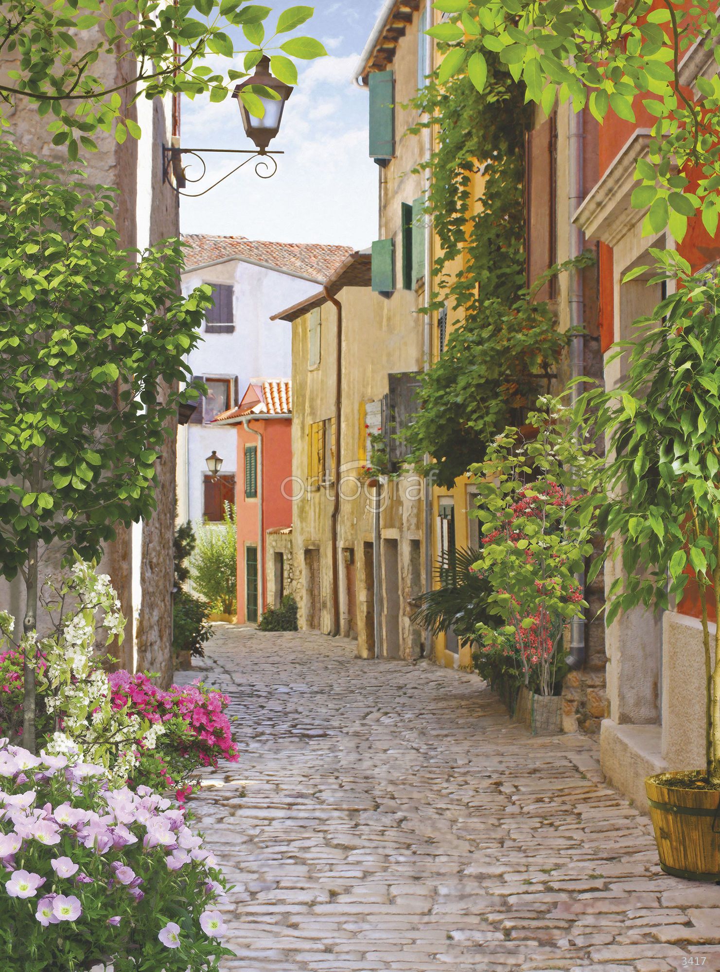Сюжет изображения передает атмосферу уютной улочки небольшого города с мощеной дорогой и зелеными растениями по обе стороны. Такой сюжет создает ощущение умиротворения и подойдет для помещений, где важно ощущение покоя и уюта. Особенно хорошо смотрится в домашней обстановке или местах отдыха, подчеркивая теплую атмосферу.