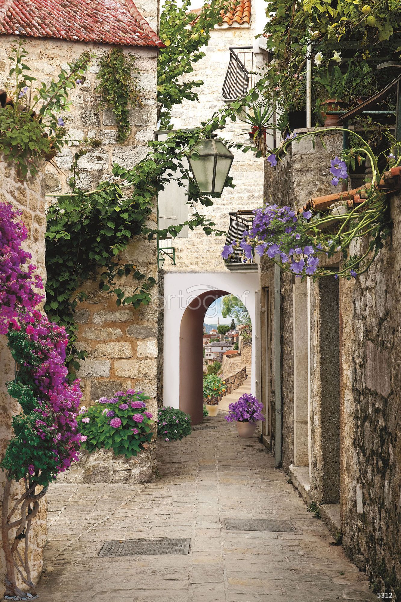 Изображение переносит в уютный средиземноморский переулок с арками, каменными стенами, яркими цветами и зелёными растениями. Атмосфера располагает к отдыху, ассоциируется с летним отпуском и прогулками по историческим городам у моря. Такой сюжет особенно хорошо подойдёт для прихожей и коридора, кухни или столовой, создавая эффект гостеприимства и солнечного настроения.