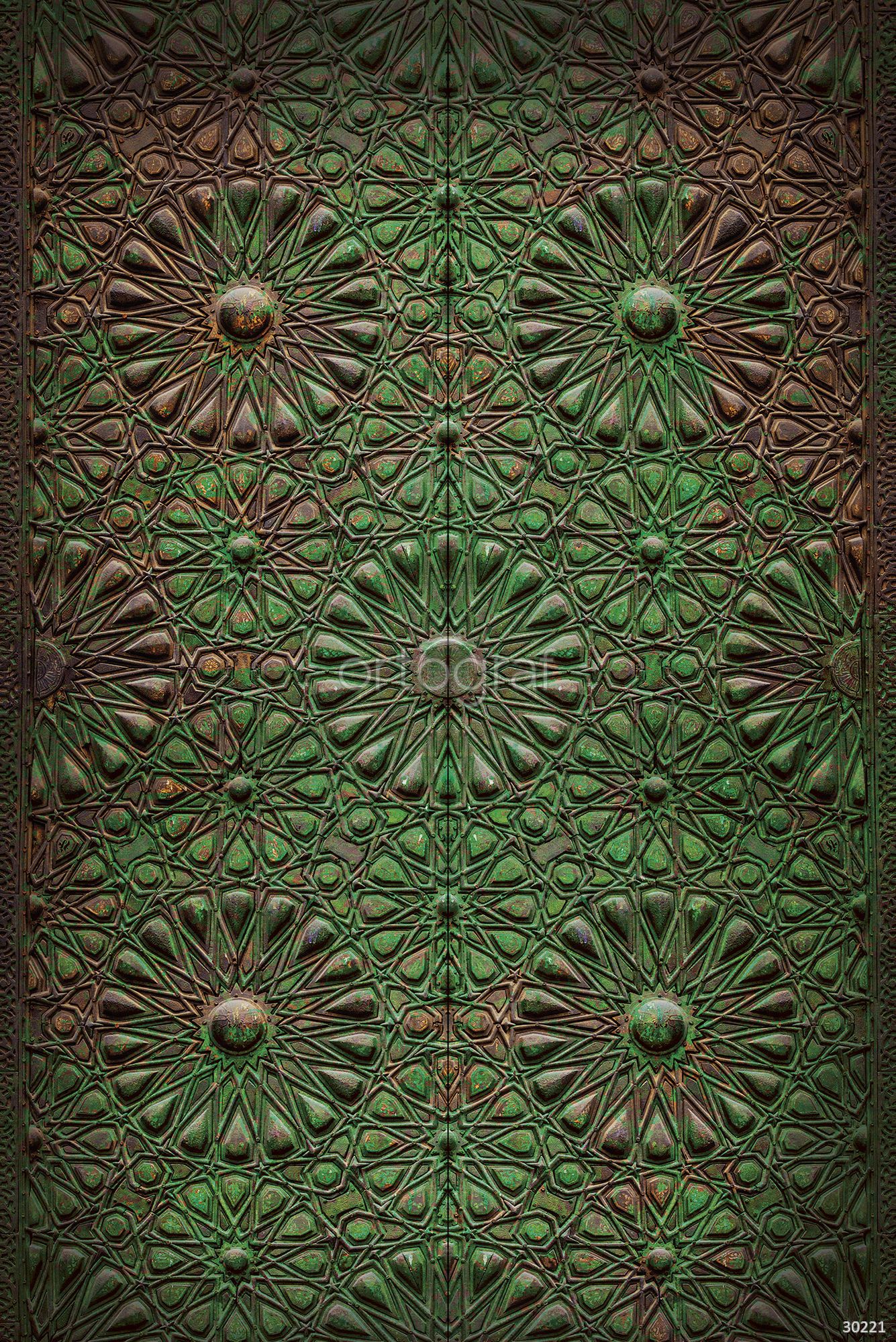 На изображении представлен декоративный восточный орнамент, выполненный в технике тиснения по металлу с патинированной зеленой поверхностью. Композиция построена на сложном геометрическом узоре с повторяющимися радиальными и звездчатыми мотивами, создающими ощущение симметрии и объёмности. Такой орнамент характерен для дверей, ворот или внутренних панелей традиционной архитектуры Ближнего Востока и Северной Африки, подчёркивая мастерство резьбы и декоративных работ.