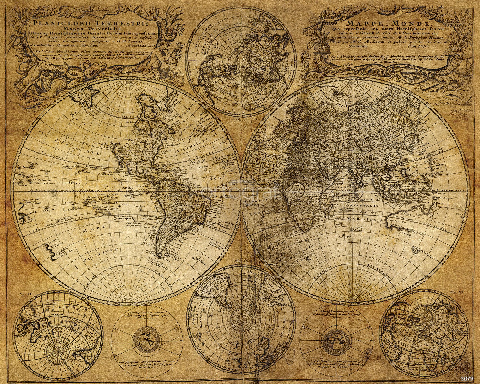 Старинная карта мира с множеством круговых проекций и декоративными надписями создает атмосферу исторических путешествий, исследования и интеллектуального уюта. Такой рисунок станет стильным акцентом в классическом или современном интерьере, добавит глубину и характер пространству.