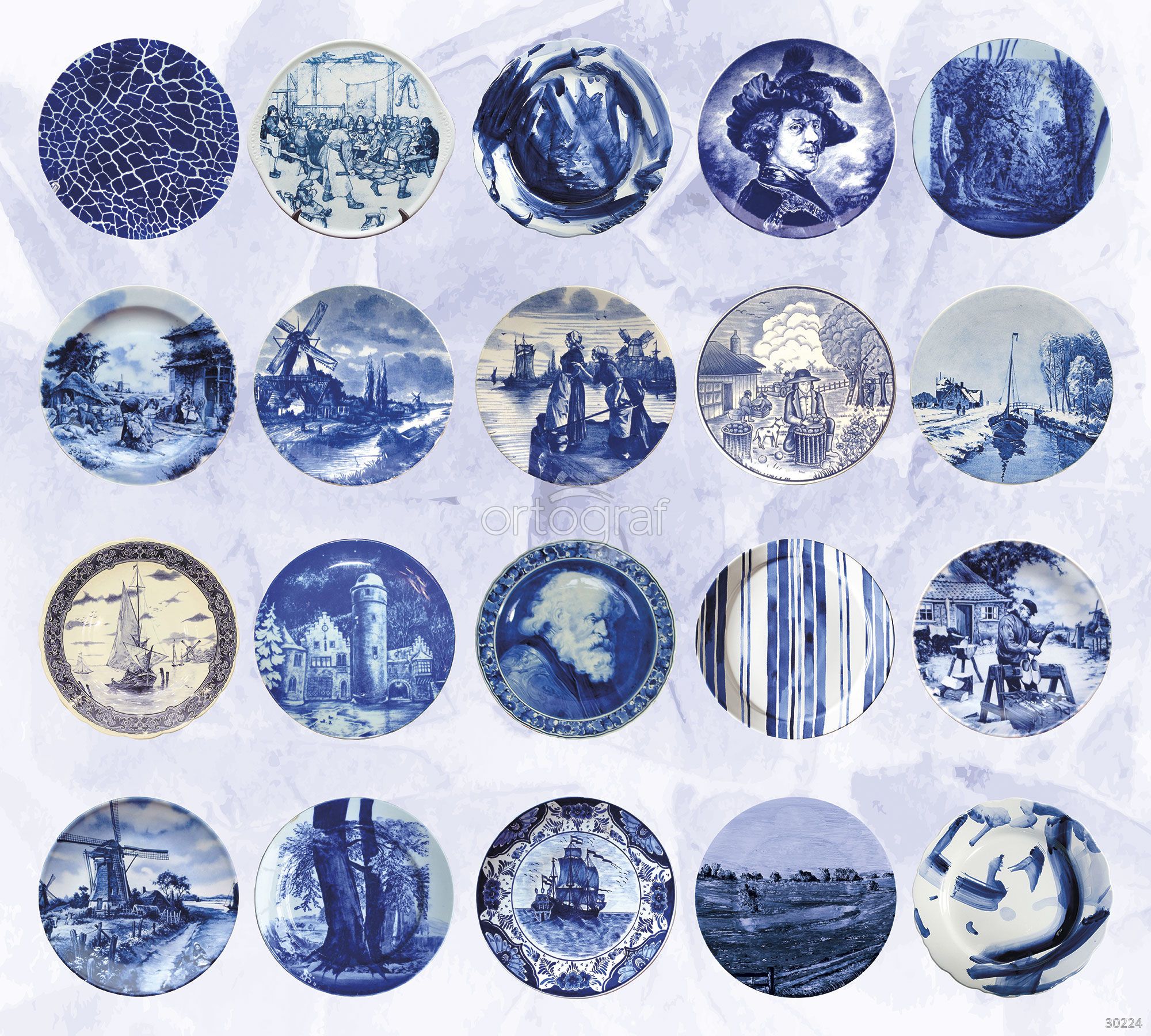 На изображении представлена коллекция декоративных тарелок в сине-белой гамме, оформленных в стиле голландского дельфтского фарфора. На тарелках изображены мельницы, корабли, городские и сельские пейзажи, а также абстрактные и современные мотивы. Композиция напоминает музейную экспозицию или частную коллекцию.