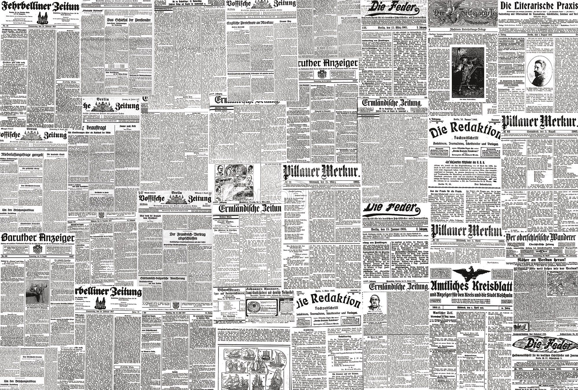 На изображении показан декоративный коллаж из множества газетных полос и страниц, располагающихся плотным фоном без выделенных объектов или героев. Композиция ассоциируется с потоком информации и создает впечатление исторического панно, напоминающего о газетной культуре и эпохе печатного слова.
