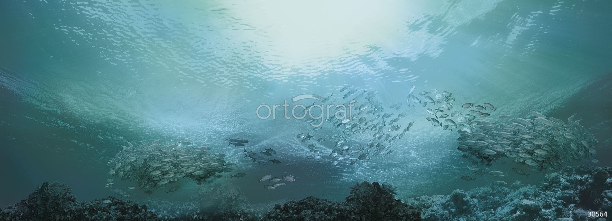 Сюжет с подводным миром: лучи света проникают сквозь толщу воды, вокруг плавают косяки рыб над коралловым рифом. Композиция наполняет помещение ощущением простора, свежести и спокойствия, подходит для создания атмосферы отдыха и гармонии. Такой рисунок отлично впишется в современные или тематические интерьеры.