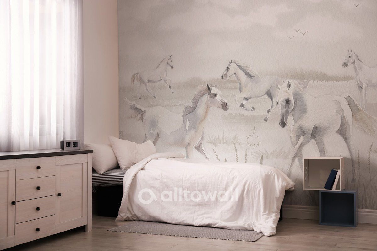 Обои «Степные лошади» посвящены величественным и красивым животным. На фоне степи пасутся белоснежные лошади, над которыми реют птицы. Использование светлых тонов станет идеальным решением для классического интерьера, спальни, в отделке которой применяются натуральные материалы и природные мотивы.