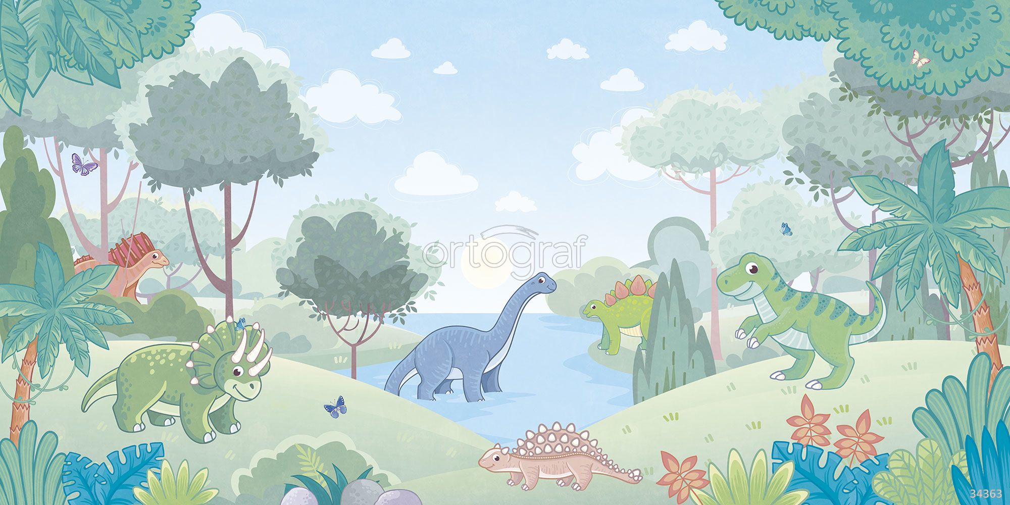 На рисунке изображён доисторический пейзаж с улыбающимися динозаврами среди пышной зелёной растительности, на фоне реки, деревьев и ясного неба. Такой весёлый сюжет создаёт атмосферу увлекательного путешествия в мир древней природы и отлично подходит для акцентирования игровой и познавательной среды. Сцена способствует развитию воображения и знакомству с доисторическими животными.