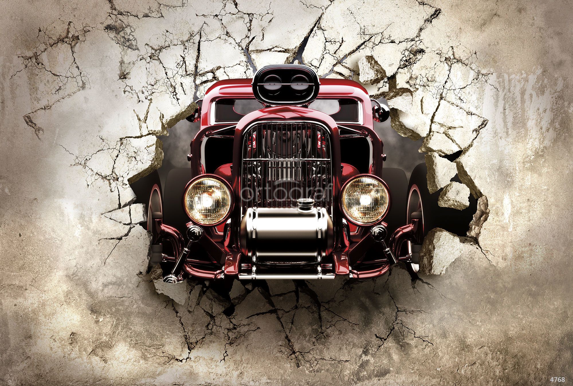 Стильная иллюстрация с эффектом прорывающей стены и винтажным автомобилем вносит динамику и смелость в интерьер. Такой сюжет станет выразительным акцентом, особенно в пространствах с современной, молодежной или тематической атмосферой. Оптимально подойдет для оформления комнаты подростка, офиса или зоны отдыха.