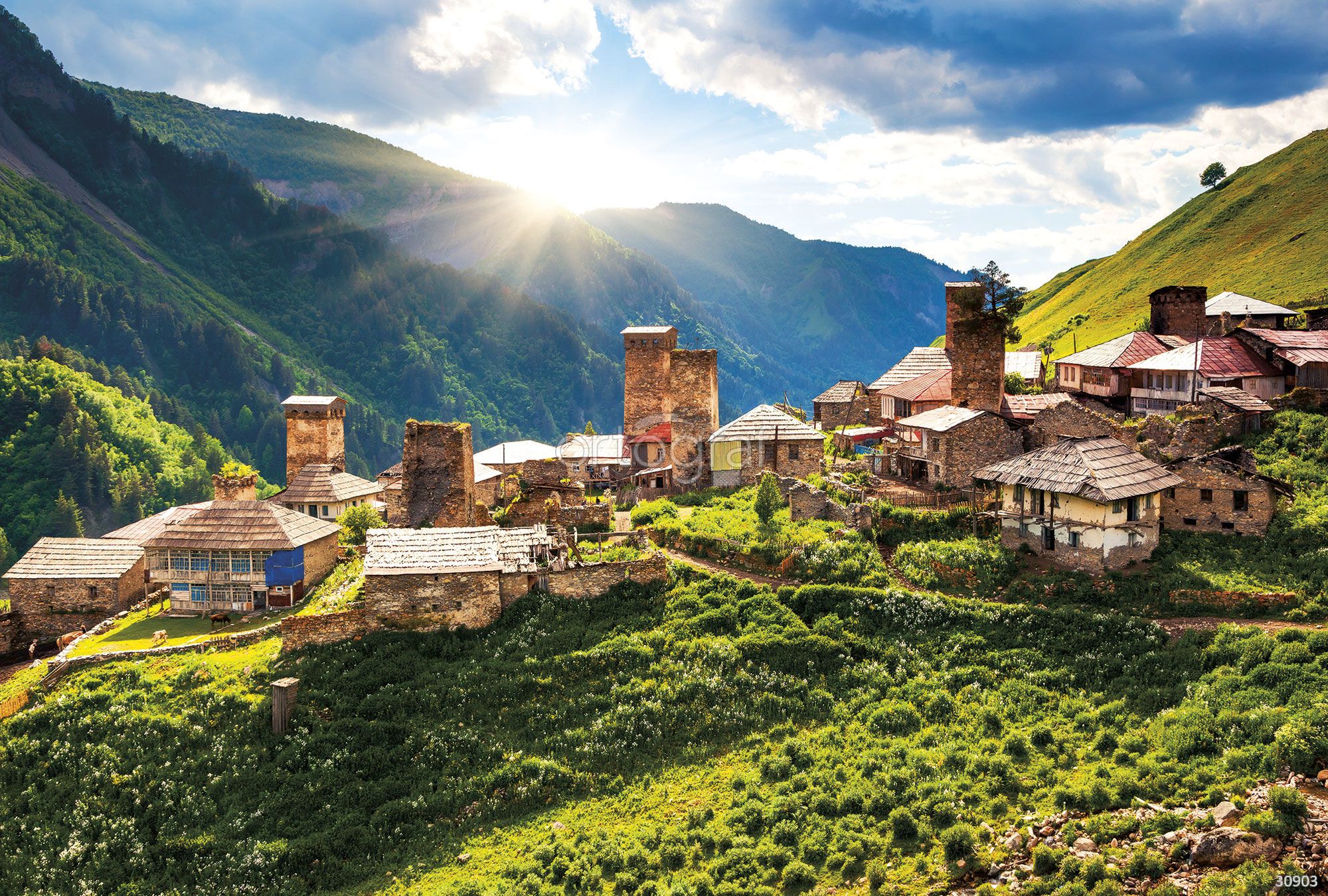 Аутентичный горный пейзаж с традиционным селением, каменными домами и сторожевыми башнями на фоне живописных склонов и лесов. Солнце, пробивающееся сквозь облака, наполняет сцену теплом и чувством уюта. Такой сюжет привнесет нотки истории, природной гармонии и атмосферу уединения в любой современный интерьер.