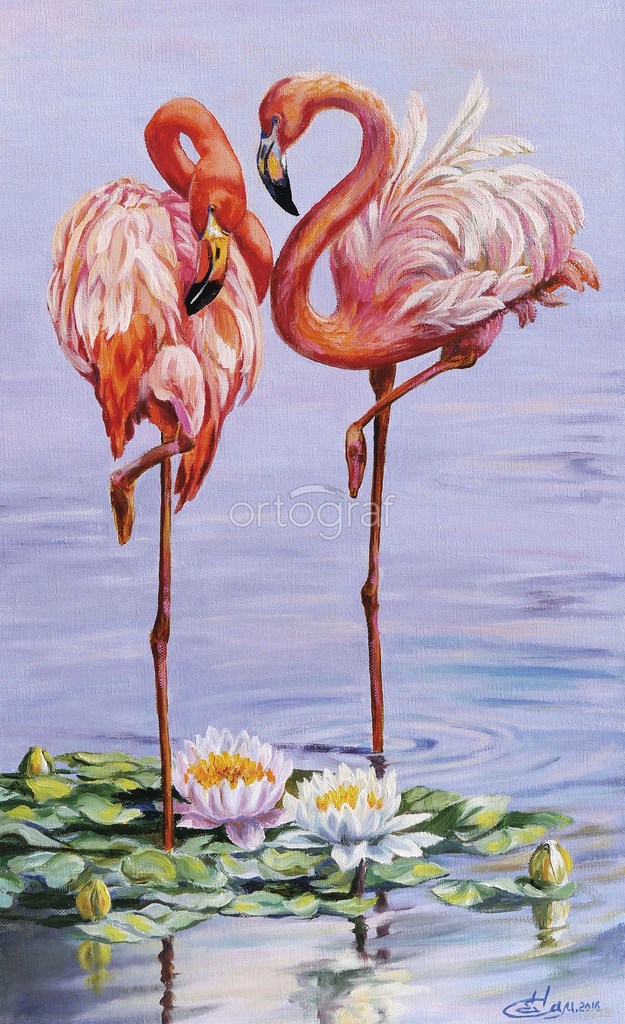 Две грациозные птицы фламинго стоят на одной ноге среди кувшинок на спокойной водной глади, создавая ощущение гармонии и экзотического очарования Такой сюжет прекрасно подойдет для оформления спальни, гостиной или офиса, придавая пространству атмосферу уюта, изысканности и мечтательности Изображение подчеркнет современный или экзотический стиль интерьера и станет ярким акцентом в любом помещении