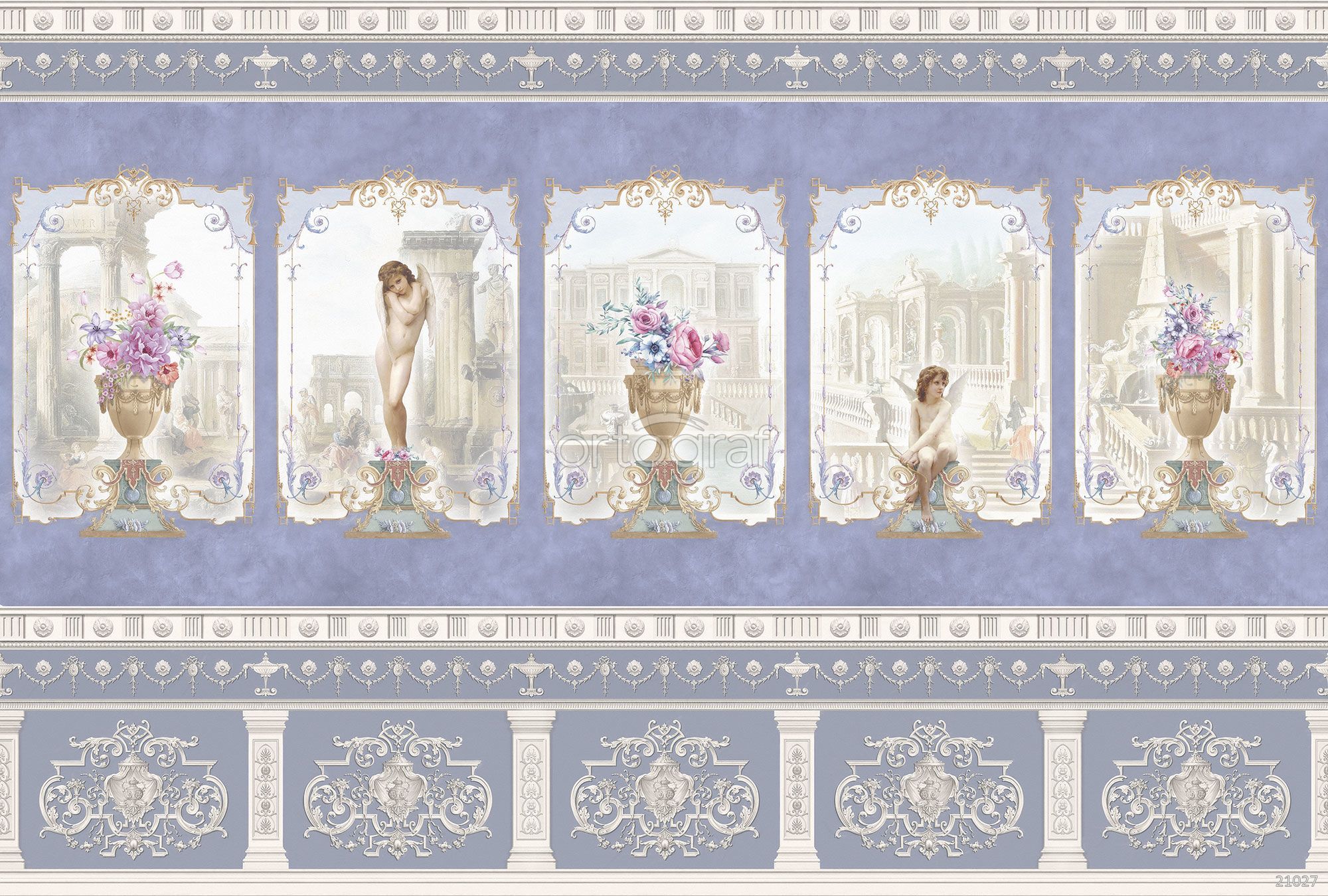 Сюжетные панели, оформленные в классическом стиле, изображают античные фонтаны, вазы с цветами и изящные статуи. На дальнем плане — архитектурные элементы дворцов, колоннады и пышные сады, что создает атмосферу эпохи Возрождения и аристократической романтики.