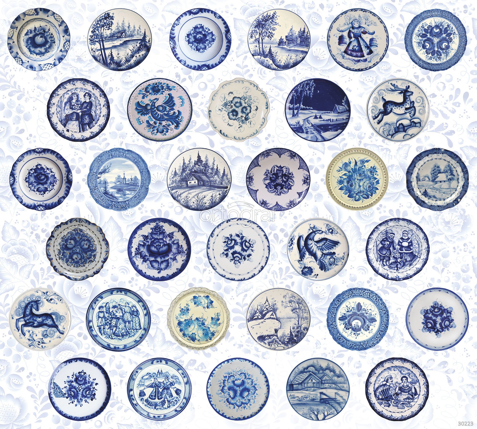 На изображении представлена декоративная коллекция традиционных тарелок с синим рисунком, размещённых в плотной сетке на светлом фоне с узорчатым орнаментом. Изображения на тарелках — это классические мотивы: пасторальные пейзажи с домиками и деревьями, сценки с людьми, лошадьми, птицами, а также цветочные и орнаментальные композиции в разных оттенках синего и голубого. Декор выполнен в характерной технике росписи, напоминающей русское гжельское искусство, аранжировка напоминает музейную или коллекционную подачу редкого фарфора.