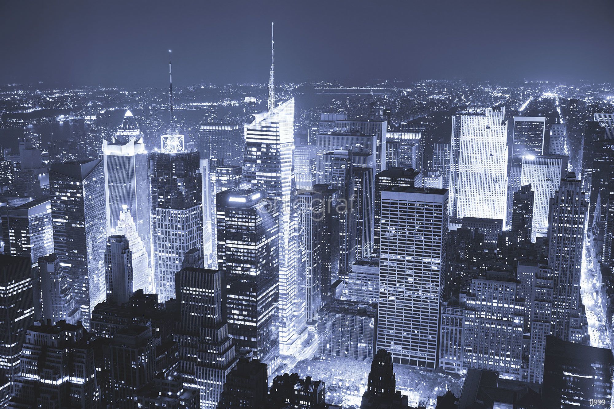 Панорамный вид на ночной мегаполис с высотными зданиями и освещёнными улицами, снимок выполнен в урбанистическом стиле. Такой сюжет создает атмосферу динамики, современности и открытого пространства, идеально подчеркивая стиль интерьера. Подойдет для помещений, где ценится энергия большого города и минималистичный акцент.