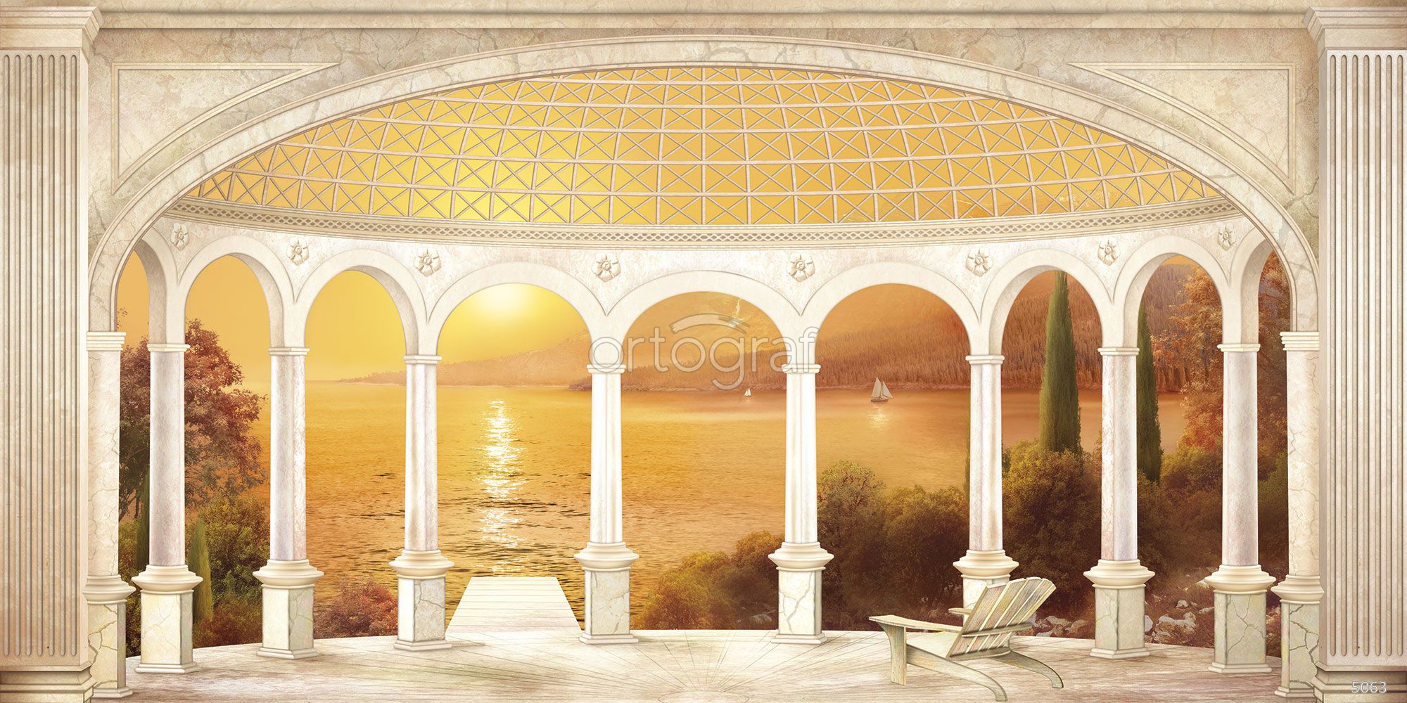 Роскошная аркада с колоннами и купольной крышей открывает вид на спокойное озеро с яхтами и уходящим за горизонт солнцем, создавая атмосферу умиротворения и отдыха. Детали архитектуры подчеркивают чувство гармонии и элегантности, наполняя пространство светом и уютом. Такой сюжет идеально подойдет для интерьеров, где нужна расслабляющая, вдохновляющая атмосфера.