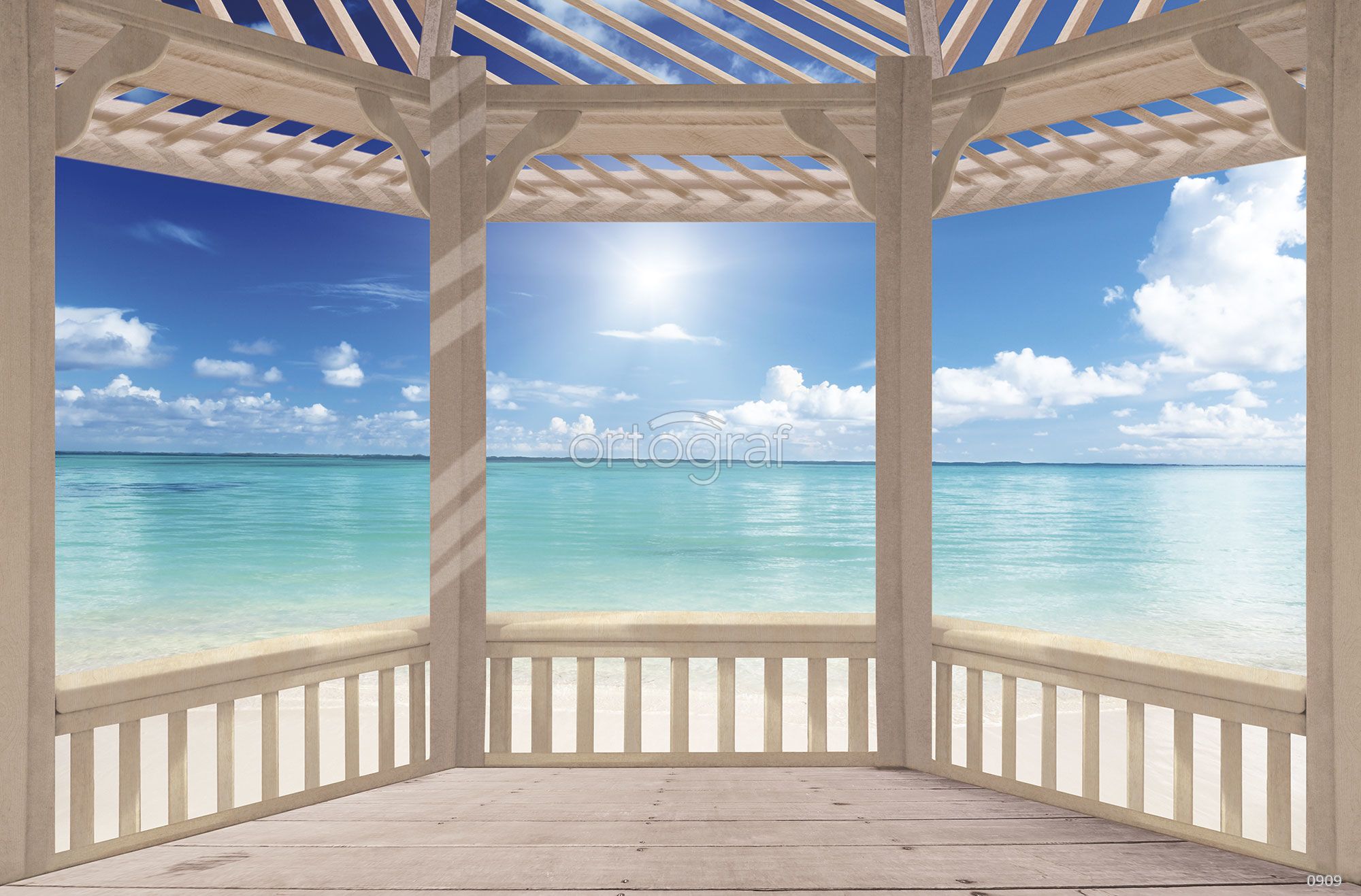 Вид с террасы или беседки на спокойное море и небо с облаками создает ощущение отдыха и умиротворения, визуально увеличивает пространство и придает интерьеру свежесть. Такой сюжет прекрасно подойдет для мест, где требуется создать расслабляющую атмосферу, идеально гармонирует с современными стилями в оформлении. Особенно хорош для зоны отдыха в гостиной, столовой или спальни.