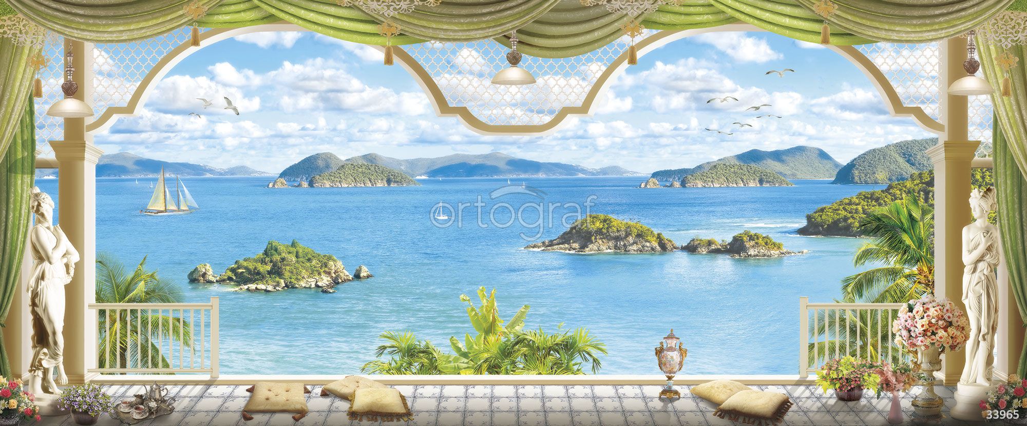 Изображение создает эффект террасы с видом на живописные морские острова, парусники, скульптуры и декоративные растения, что придает интерьеру атмосферу отдыха и простора. Такой сюжет прекрасно подойдет для пространств, в которых хочется добавить ощущение света, свежести и открытости. Особенно гармонично будет смотреться в гостиной, столовой или прихожей и коридоре.
