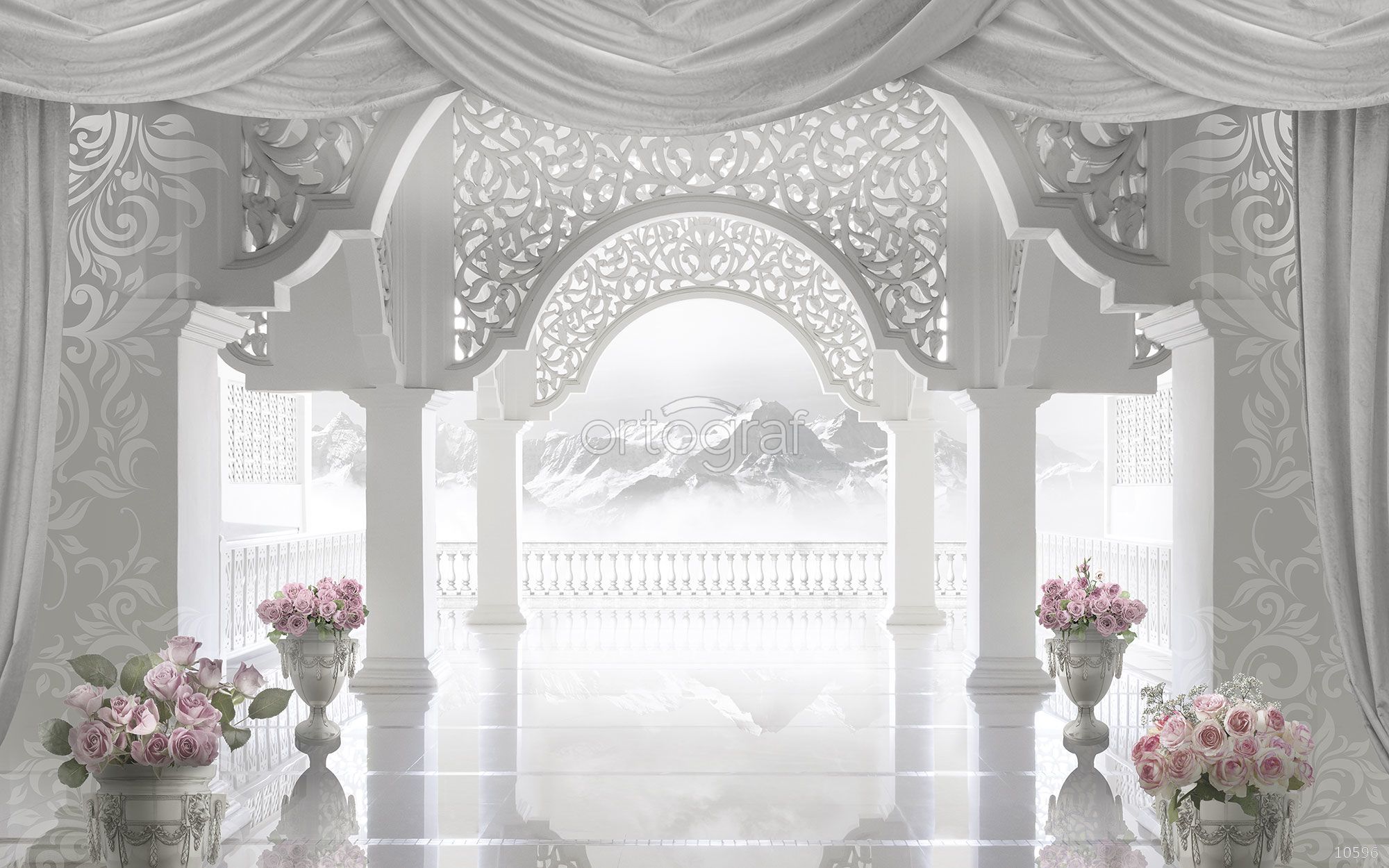 На этой сюжетной композиции изображён элегантный зал с декоративными арками и колоннами, открывающий вид на величественные горные вершины вдали. Интерьер украшен орнаментальными элементами и вазонами с цветочными букетами, создающими атмосферу торжественности и гармонии.