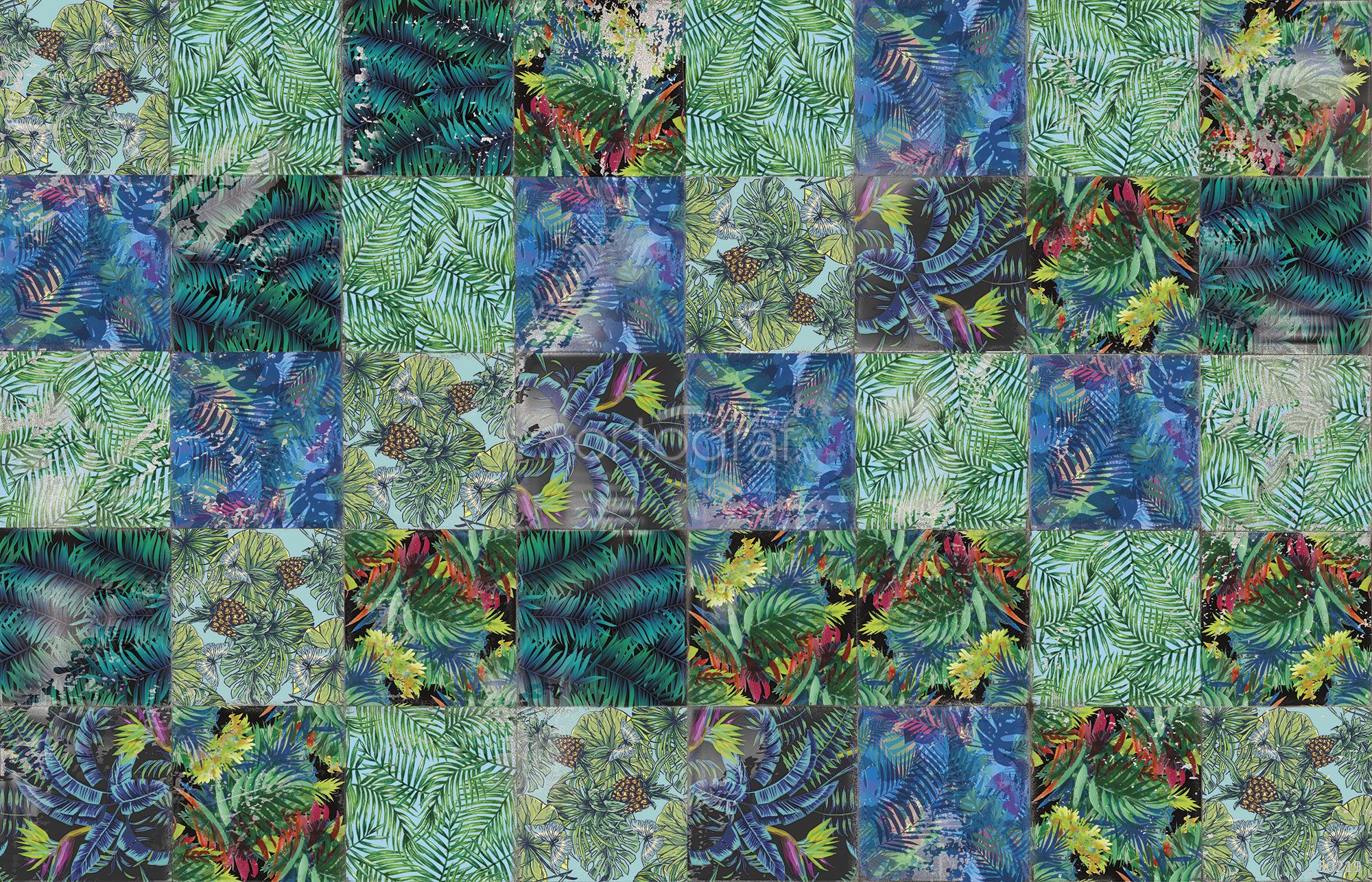 На изображении представлен декоративный паттерн из квадратных фрагментов с тропическими листьями, хвойными ветками и яркими орнаментами. Композиция напоминает мозаику или текстильный принт, где сочетаются стилизованные листья, цветы, элементы растительности и контрастные живописные пятна. Палитра включает разнообразные оттенки зелёного, синего, голубого, а отдельные участки насыщены акцентами красного, жёлтого и фиолетового, что создаёт атмосферу тропиков, природной пышности и свежести.
