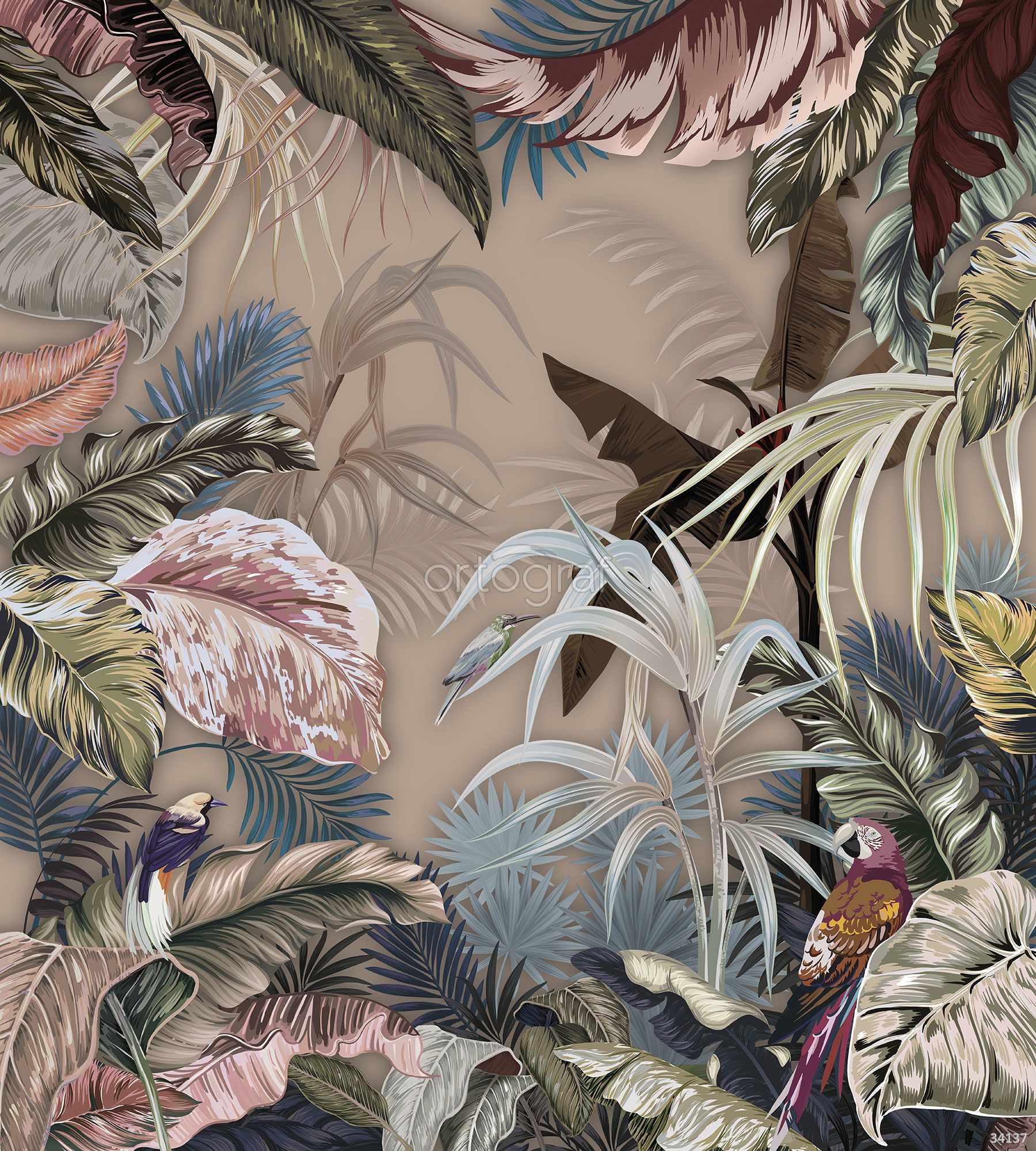 Изображение густой тропической растительности с экзотическими птицами создаёт впечатление погружения в дикие джунгли. Такой сюжет добавит интерьеру яркость, нестандартность и выразительность, подчеркнув индивидуальность пространства. Хорошо подойдёт для оформления гостиной, офиса или столовой, а также может стать акцентом в прихожей и коридоре.