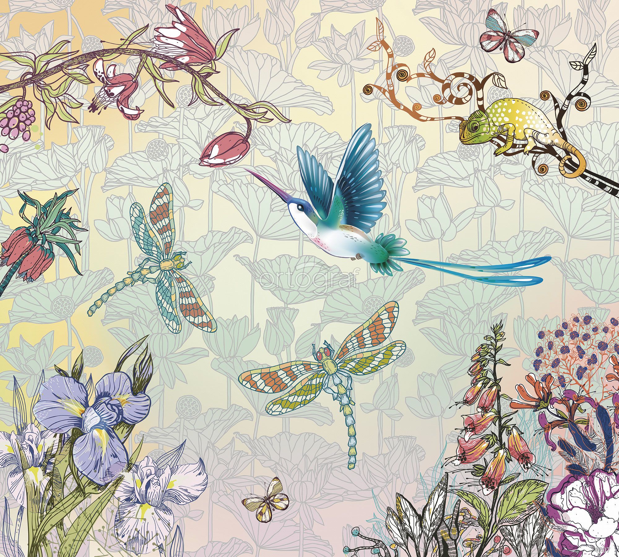 Рисунок в стиле графики с экзотической птицей, цветами, стрекозами, хамелеоном и бабочками создает ощущение сказочного сада, наполненного жизнью и фантазией. Такой сюжет идеально подходит для создания уютной, вдохновляющей и легкой атмосферы, особенно в детских и творческих пространствах. Прекрасно подойдёт для оформления комнаты, где важны креативность и мечтательность.