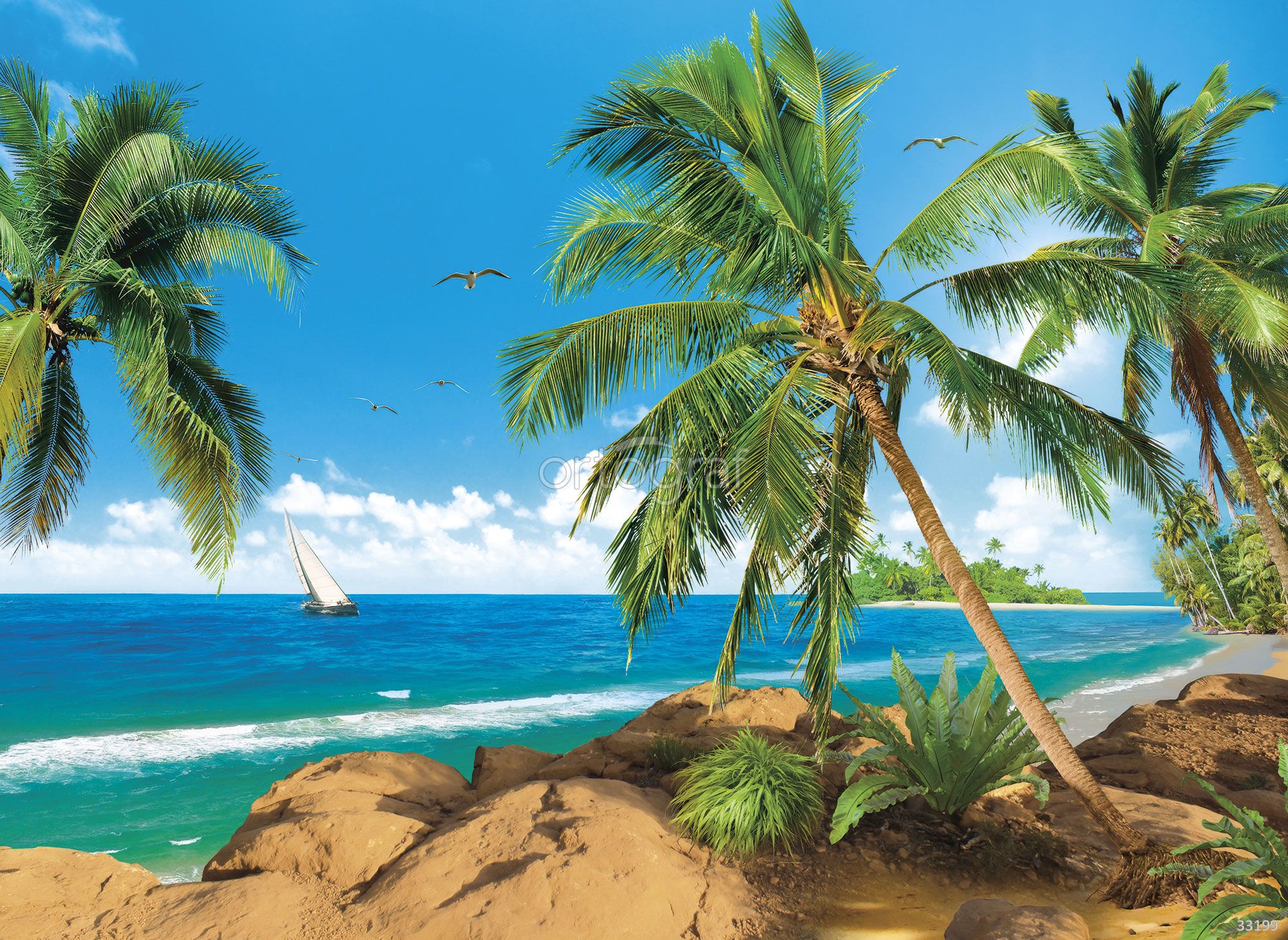 На изображении представлен тропический берег с пальмами, морем, скалами, парусником на горизонте и пролетающими птицами. Такая композиция создаёт атмосферу свободы, экзотики и летнего вдохновения, привносит ощущение простора и свежести в помещение.