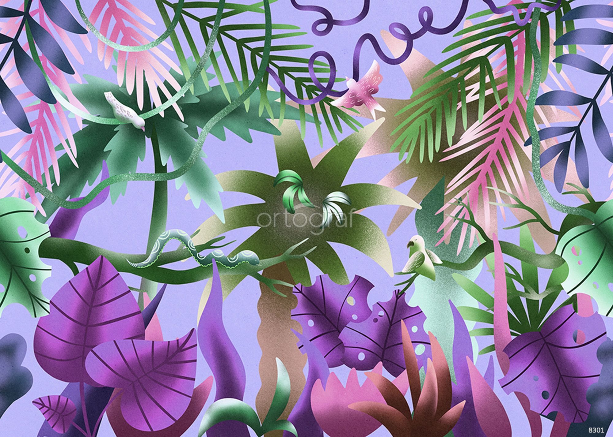 Графичная композиция с экзотическими растениями и тропическими птицами создает атмосферу джунглей и дикой природы. Такой рисунок добавляет энергии, динамики и современности в интерьер, отлично подойдет для ярких и креативных пространств. Особенно хорошо впишется туда, где хочется добавить нотку экзотики и уюта, вдохновляющего на творчество и мечты.