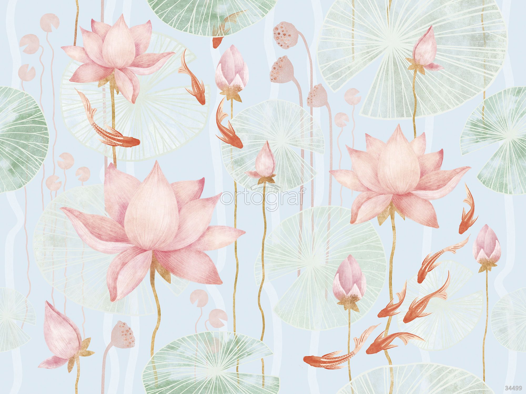 На рисунке изображены водные лилии, карпы и плавная ритмика водной глади, создающие атмосферу спокойствия, гармонии и естественной красоты. Такой сюжет идеально подходит для оформления пространства, где ценится расслабляющая и природная эстетика, способствующая отдыху и умиротворению. Изображение помогает добавить интерьеру лёгкости и визуальной глубины.