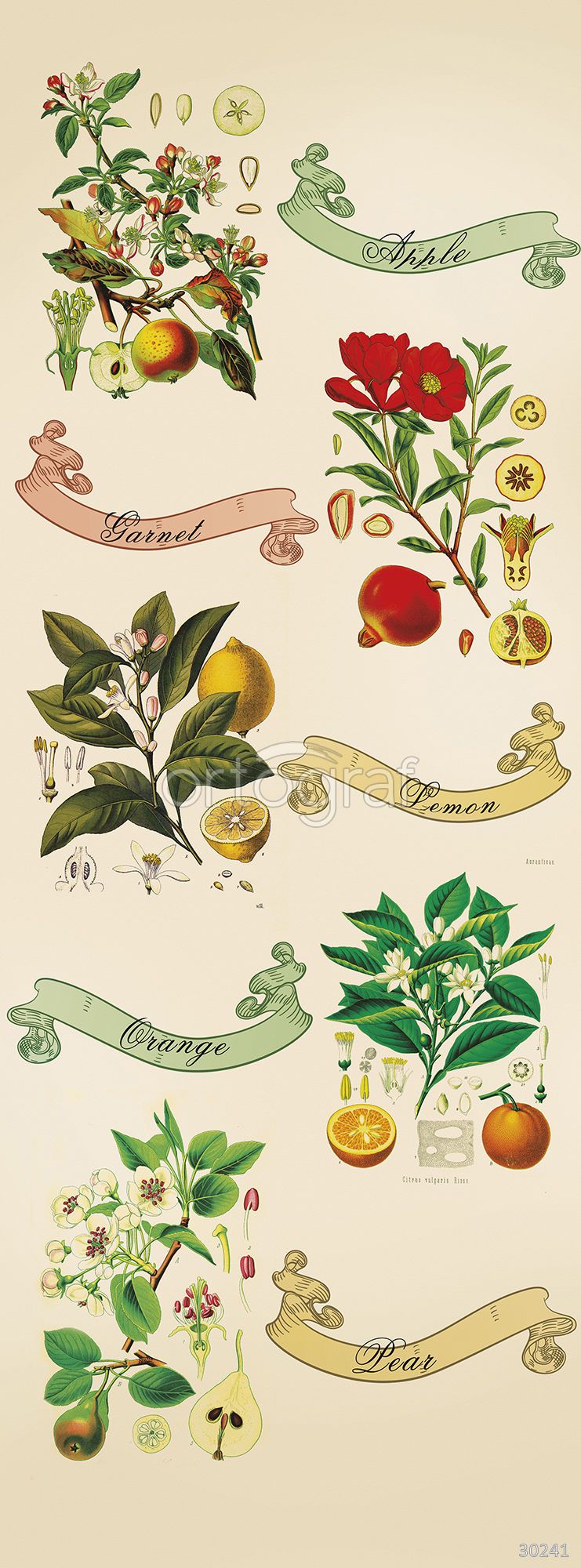 На изображении представлены ботанические иллюстрации фруктовых деревьев с подписями: видны детализированные ветви, цветы, плоды и их разрезы. Композиция напоминает старинный учебный плакат, демонстрирующий строение и разнообразие яблони, граната, лимона, апельсина и груши.