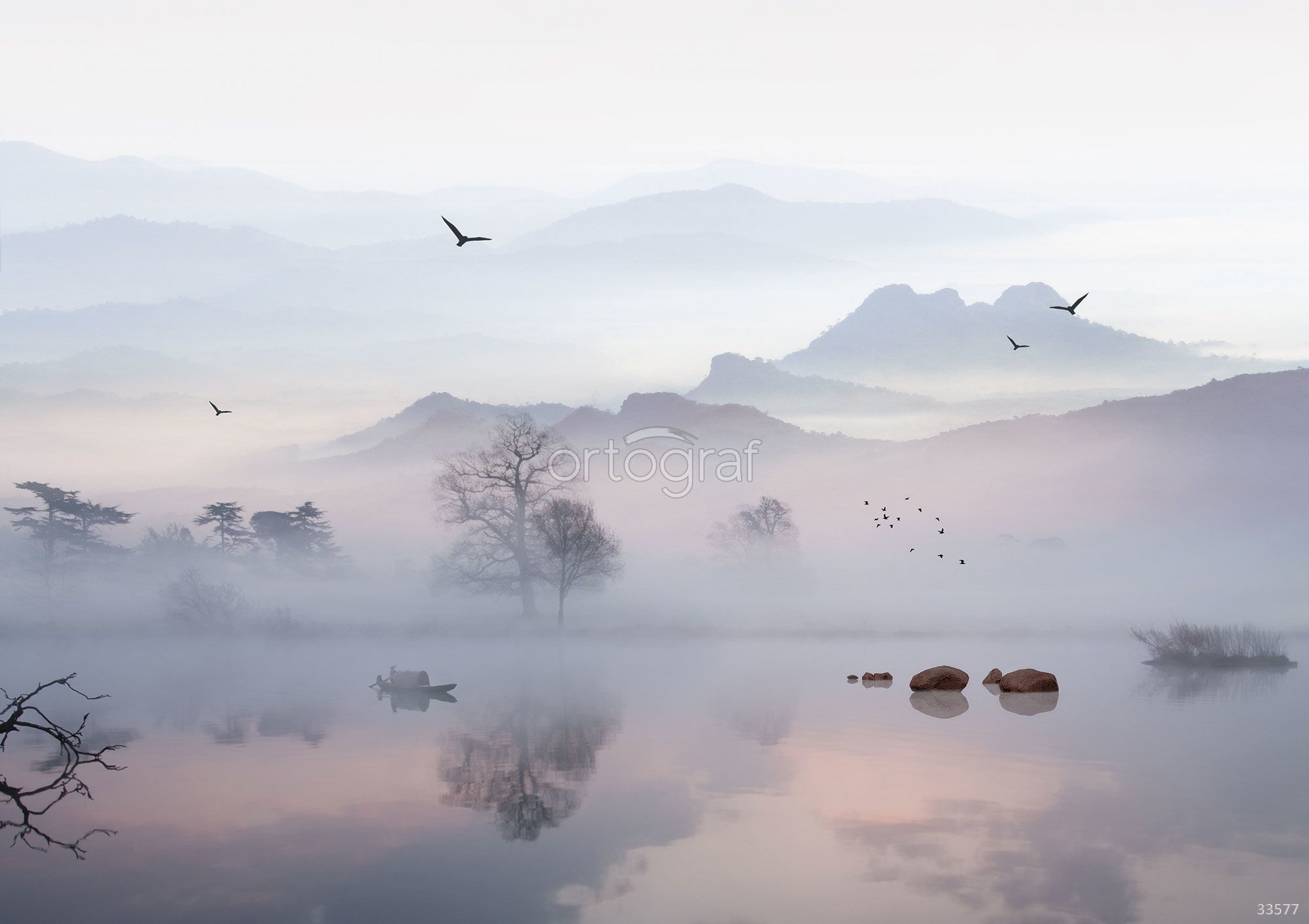 Пейзаж с мягкими силуэтами гор, гладким озером, отражениями деревьев и летящими птицами наполняет пространство спокойствием и умиротворением. Такое изображение идеально подойдет для создания атмосферы отдыха и гармонии в жилых и релакс-зонах. Прекрасный выбор для спальни, гостиной и ванной комнаты.