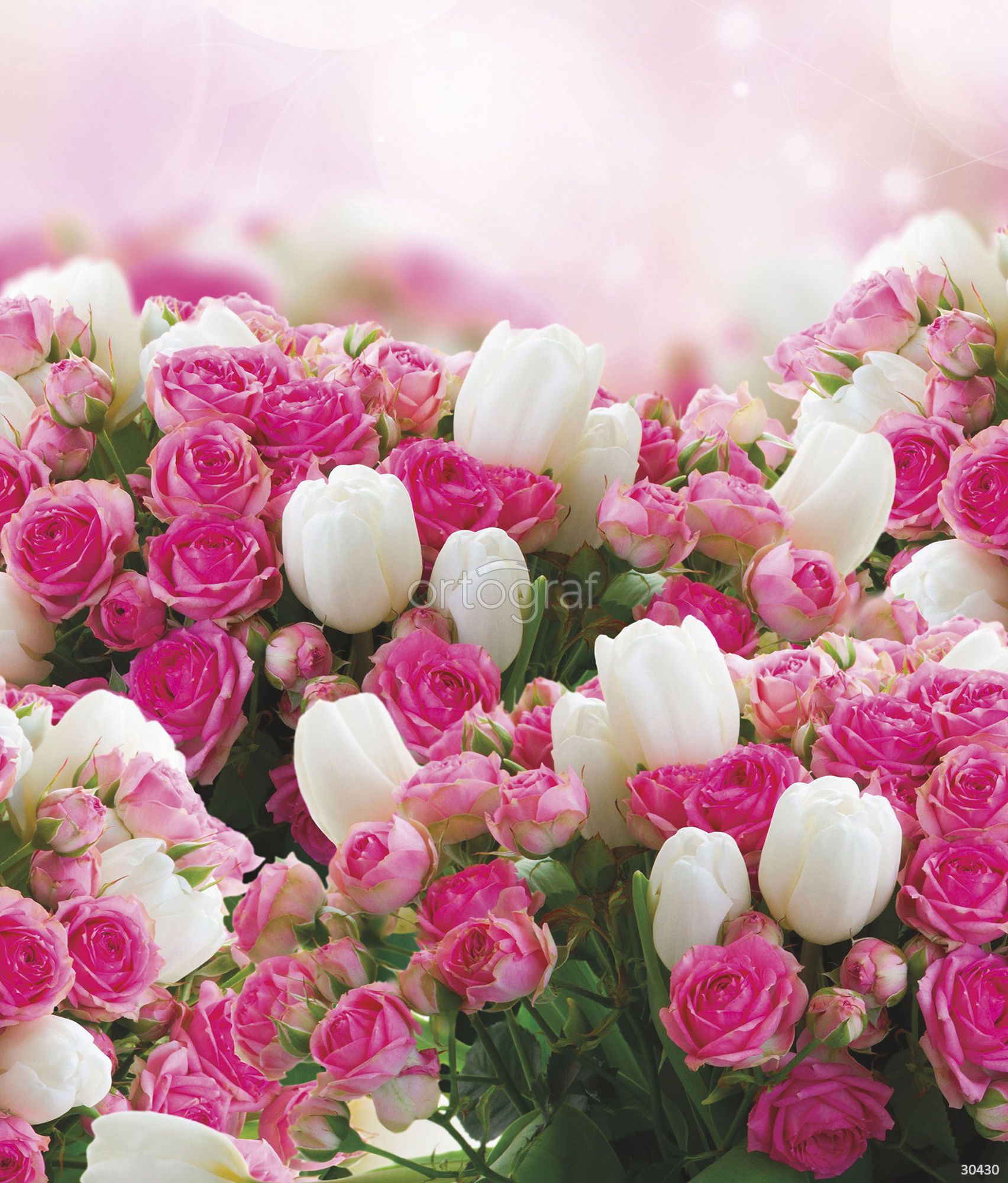 Композиция наполнена пышными бутонами и соцветиями, собранными в плотные букеты из садовых цветов разной формы. Гармоничное переплетение бутонов и лепестков придаёт изображению атмосферу свежести, уюта и изобилия живой природы.