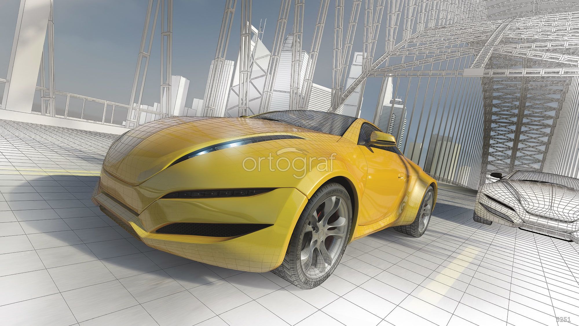 Современный сюжет с автомобилем, переходящим из 3D-модели в фотореалистичное изображение, расположенным на фоне урбанистического города и моста. Такой образ идеально подойдет для интерьеров в стиле хай-тек, современных офисов, автосалонов и творческих пространств, где ценится тематика технологий и скорости. На фото специфические достопримечательности не выделяются, изображён абстрактный городской пейзаж.