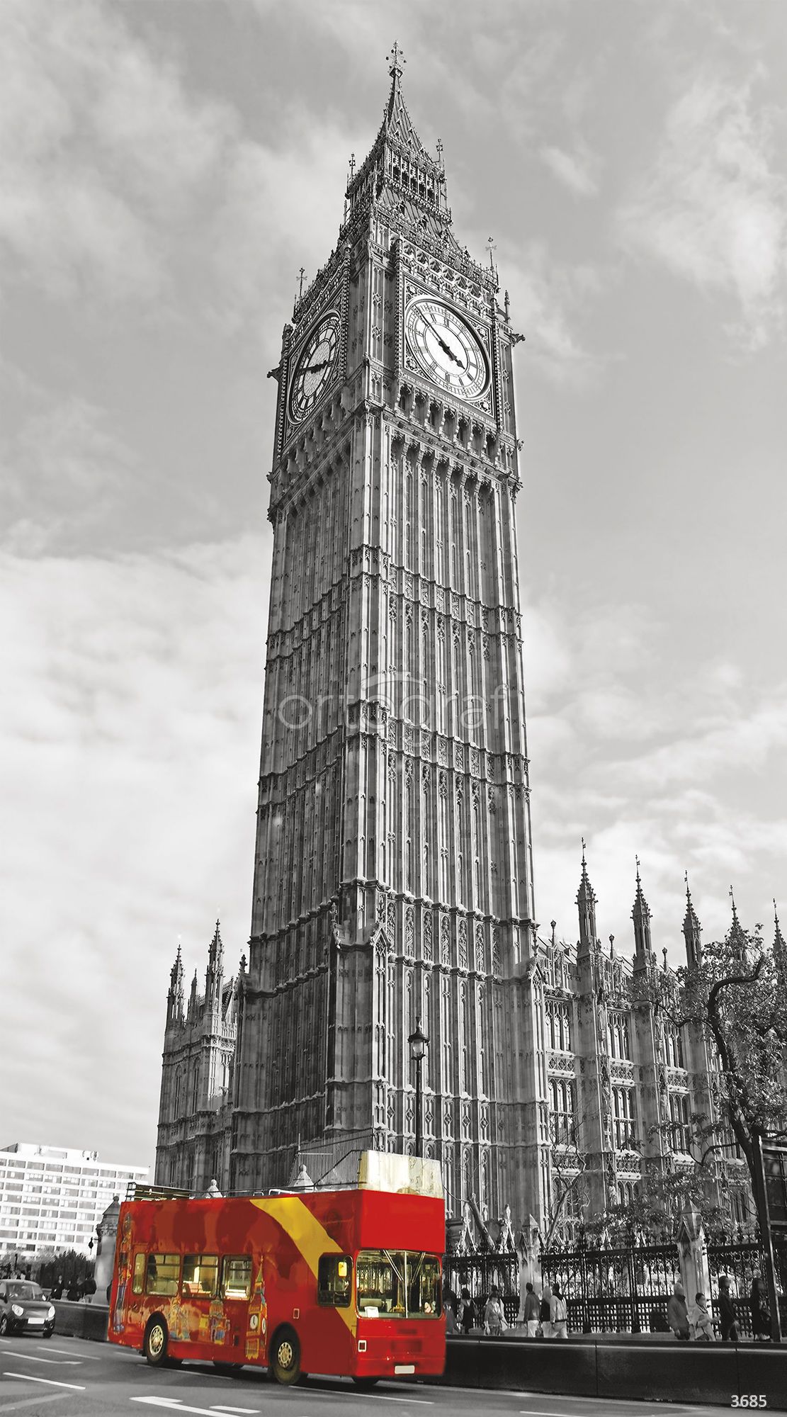 На изображении культовая достопримечательность Лондона — башня Биг-Бен, а на переднем плане — двухэтажный туристический автобус. Яркая деталь городского пейзажа создаёт динамичный и современный акцент, идеально для интерьеров с урбанистической или тематикой путешествий. Такая композиция хорошо подойдет для помещений, где ценится атмосфера мегаполиса и энергия большого города.