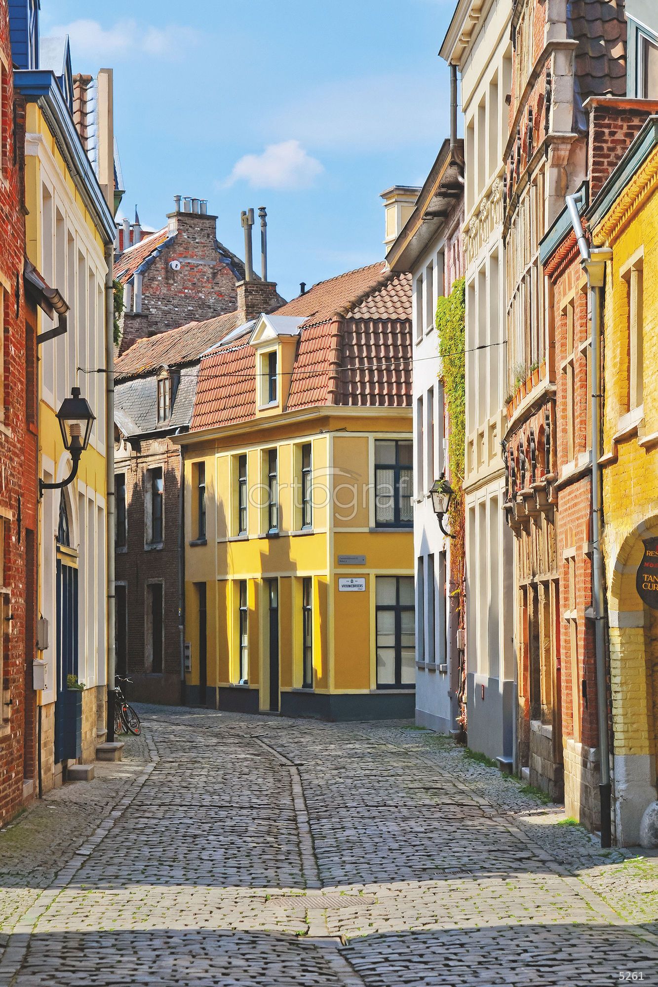 Европейская улочка с мощёной дорогой, аккуратными домами, фонарями и велосипедом создает атмосферу старого города и уюта. Такой сюжет отлично подойдет для оформления помещений, где важна атмосфера комфорта и спокойствия. На фото отсутствуют известные мировые достопримечательности, но хорошо передан дух европейской архитектуры.