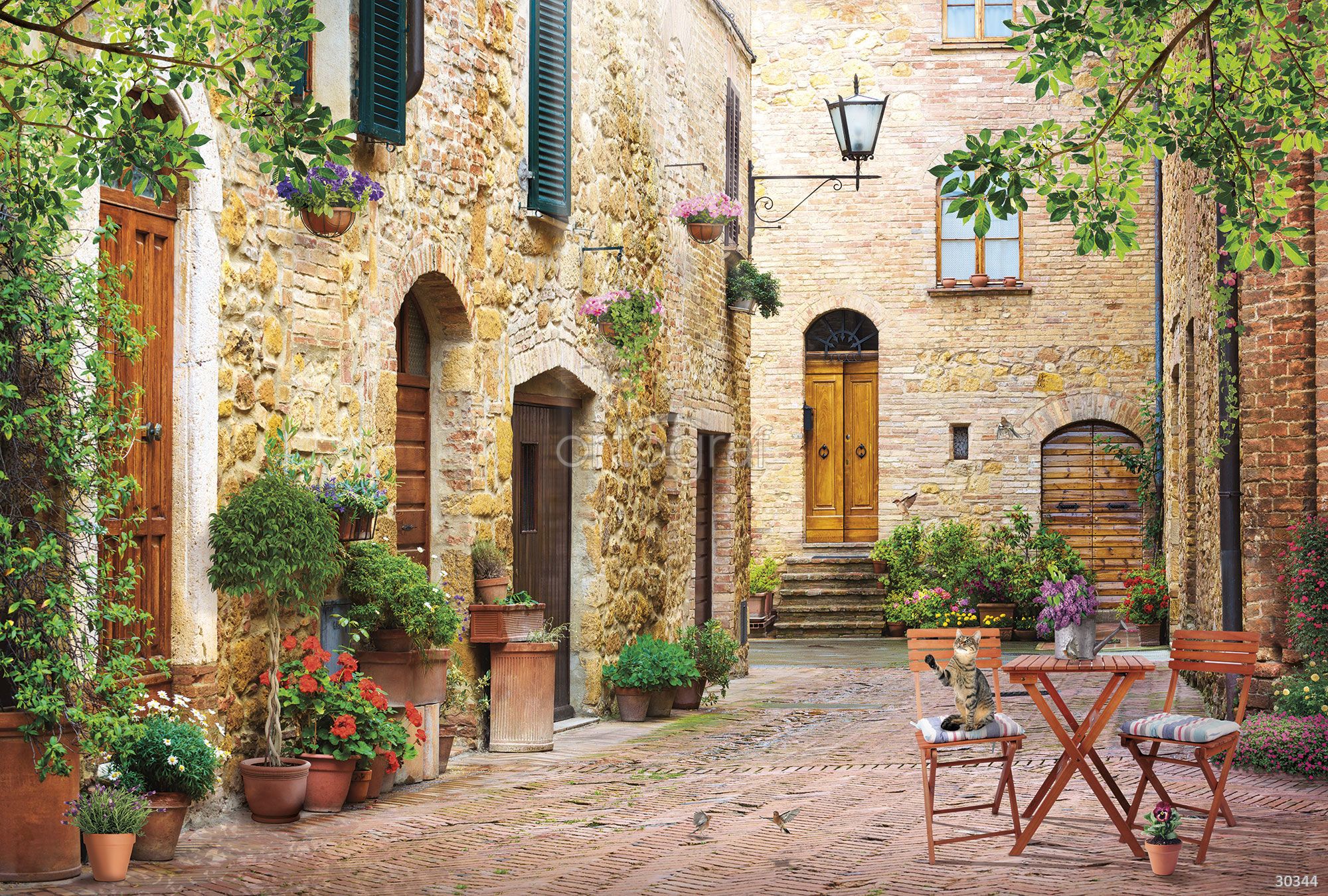 На изображении изображён живописный уголок средиземноморского или старого европейского городка: узкая мощёная улочка с домами из светлого камня, деревянными дверями и окнами со ставнями. Вдоль фасадов и у входов расставлено множество горшков с цветущими растениями, по асфальту бегают птички, а на одном из стульев за столом сидит кошка. Атмосфера уюта, спокойствия и неторопливой жизни подчёркнута цветочными композициями, винтажной садовой мебелью и обилием зелени.