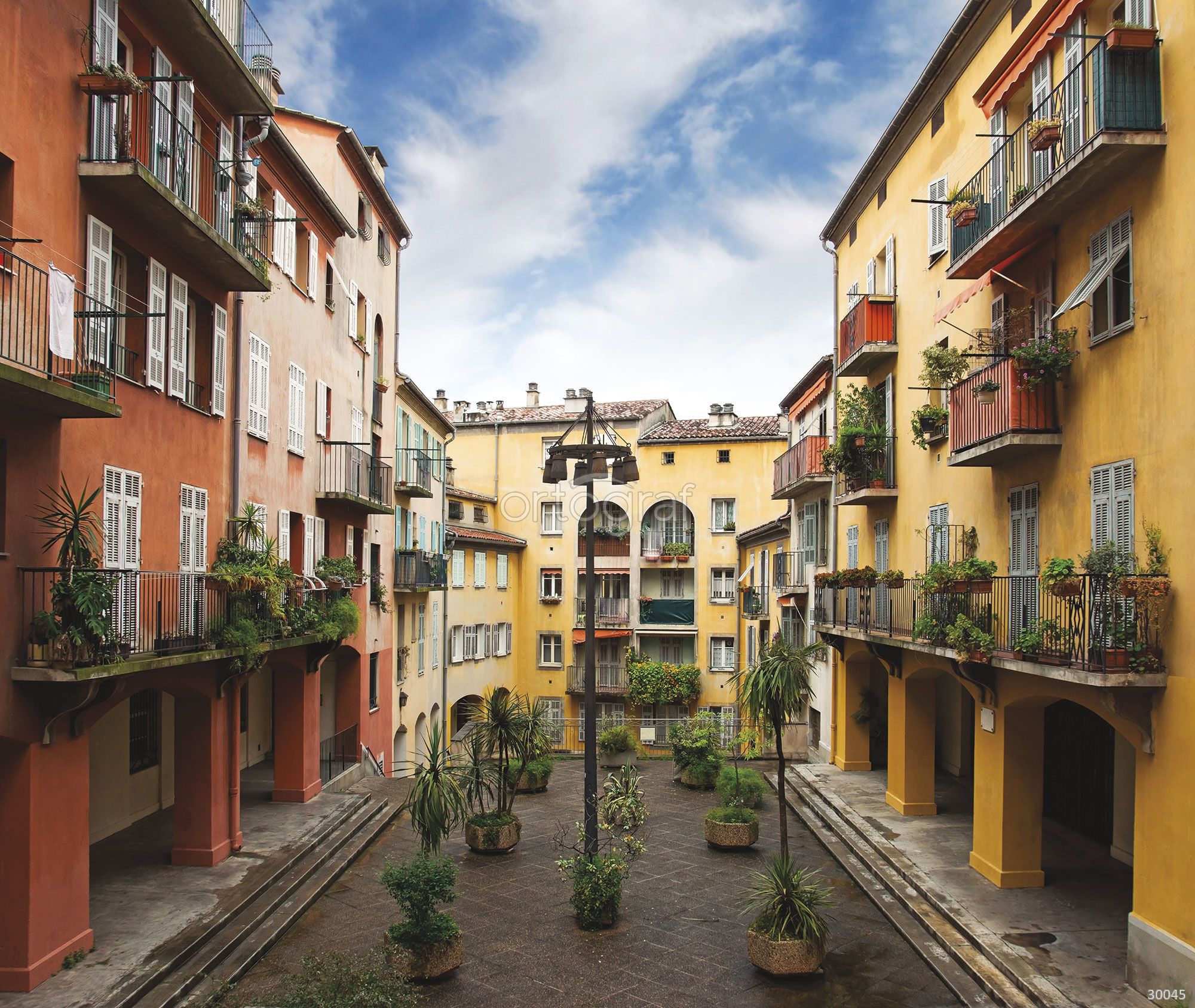 Уютный средиземноморский двор с цветочными балконами и яркими фасадами жилых домов. Во дворе растут пальмы и установлены вазоны, создаётся атмосферa тёплого южного города.