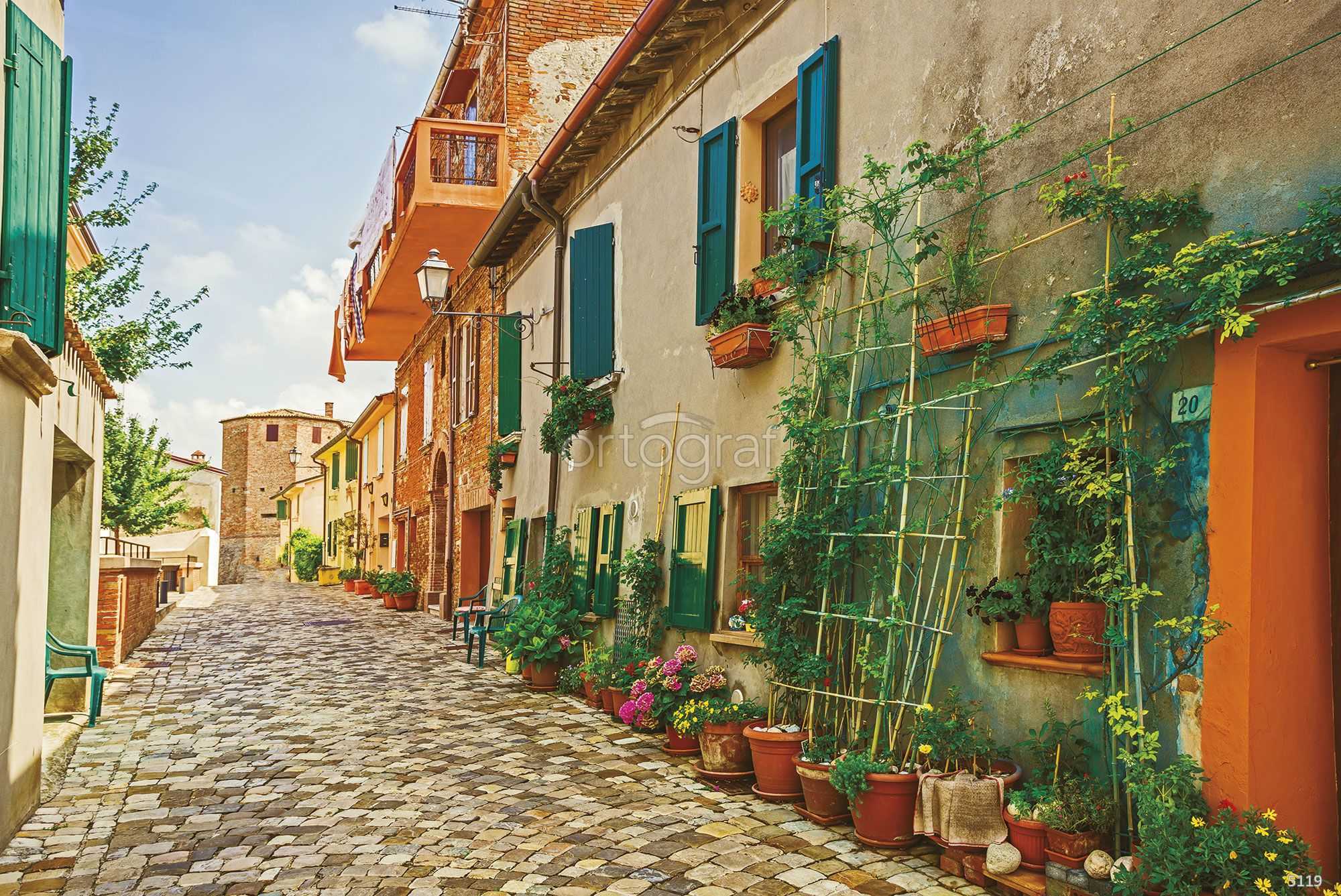 Уютная европейская улочка с мощёной дорожкой, домами с зелёными ставнями и большим количеством растений в горшках у фасадов. Атмосфера доброжелательности и уюта подчёркнута деталями быта, лавочками и пёстрыми цветами, создавая ощущение спокойствия и размеренного ритма жизни. Такой сюжет отлично впишется в интерьер, чтобы добавить тепло и душевность.