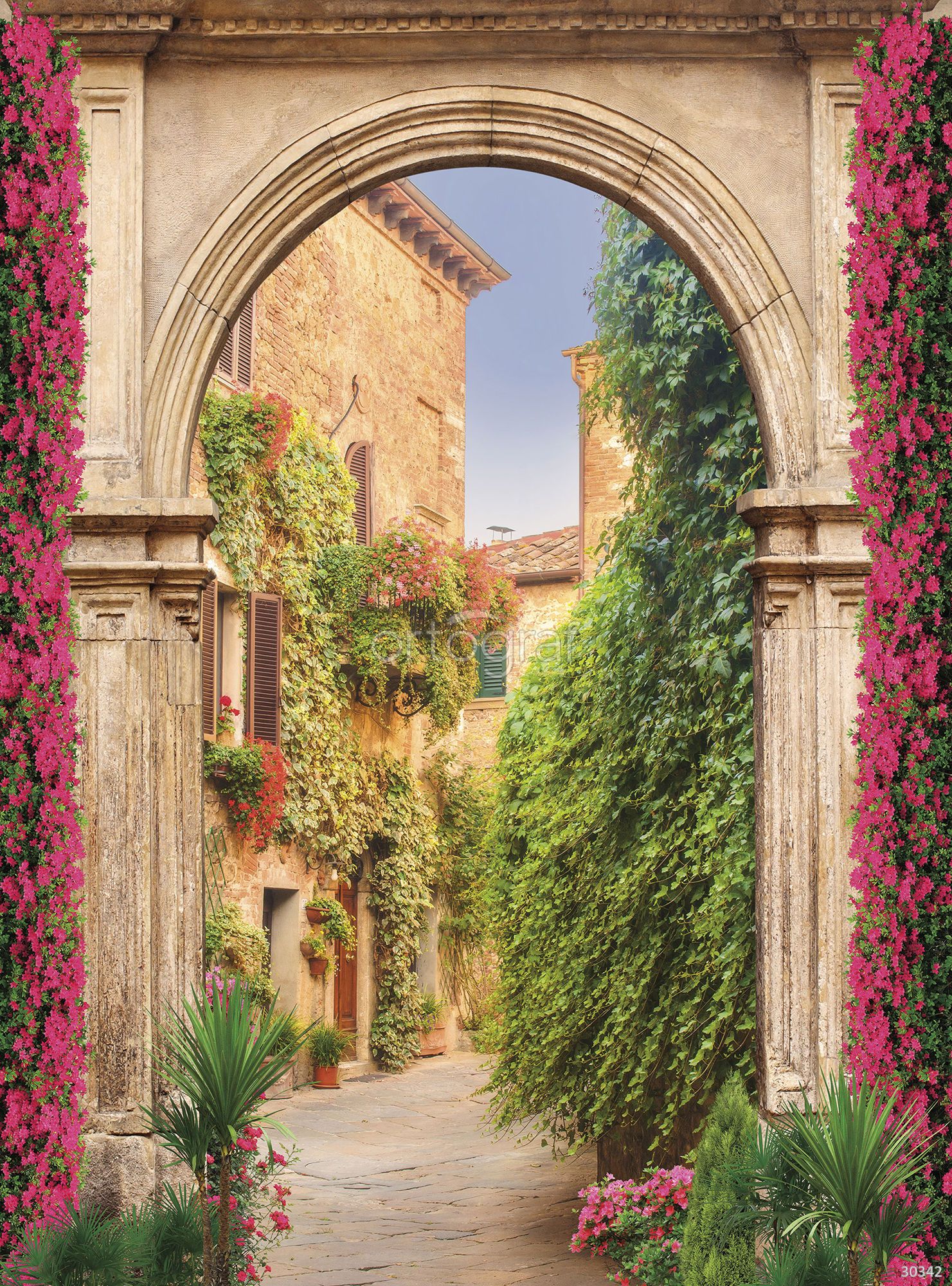 На изображении представлена живописная старая улочка европейского городка, обрамлённая массивной каменной аркой. Фасады домов выстроены из светлого камня, украшены ставнями, балконами и густыми цветочными композициями. Вдоль прохода обильно растёт зелень, а сама арка оплетена яркими розовыми цветами, что создаёт уютную, романтичную атмосферу и ощущение уединённого уголка в южной Европе.