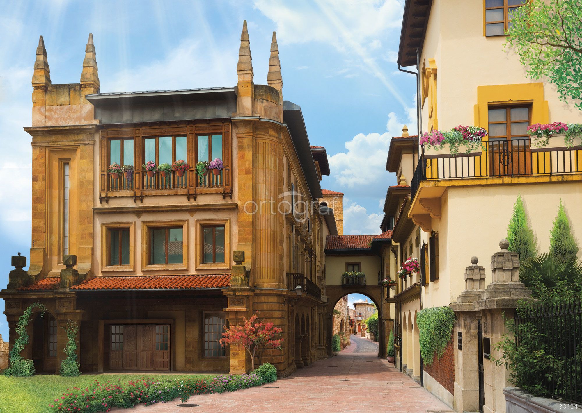 На изображении представлена живописная европейская улочка с изящными фасадами домов, украшенными балконами, цветами и арками. В перспективе виден проход через арку, ведущий к тихой мостовой, что создаёт атмосферу уюта и архитектурного гармоничного пространства.