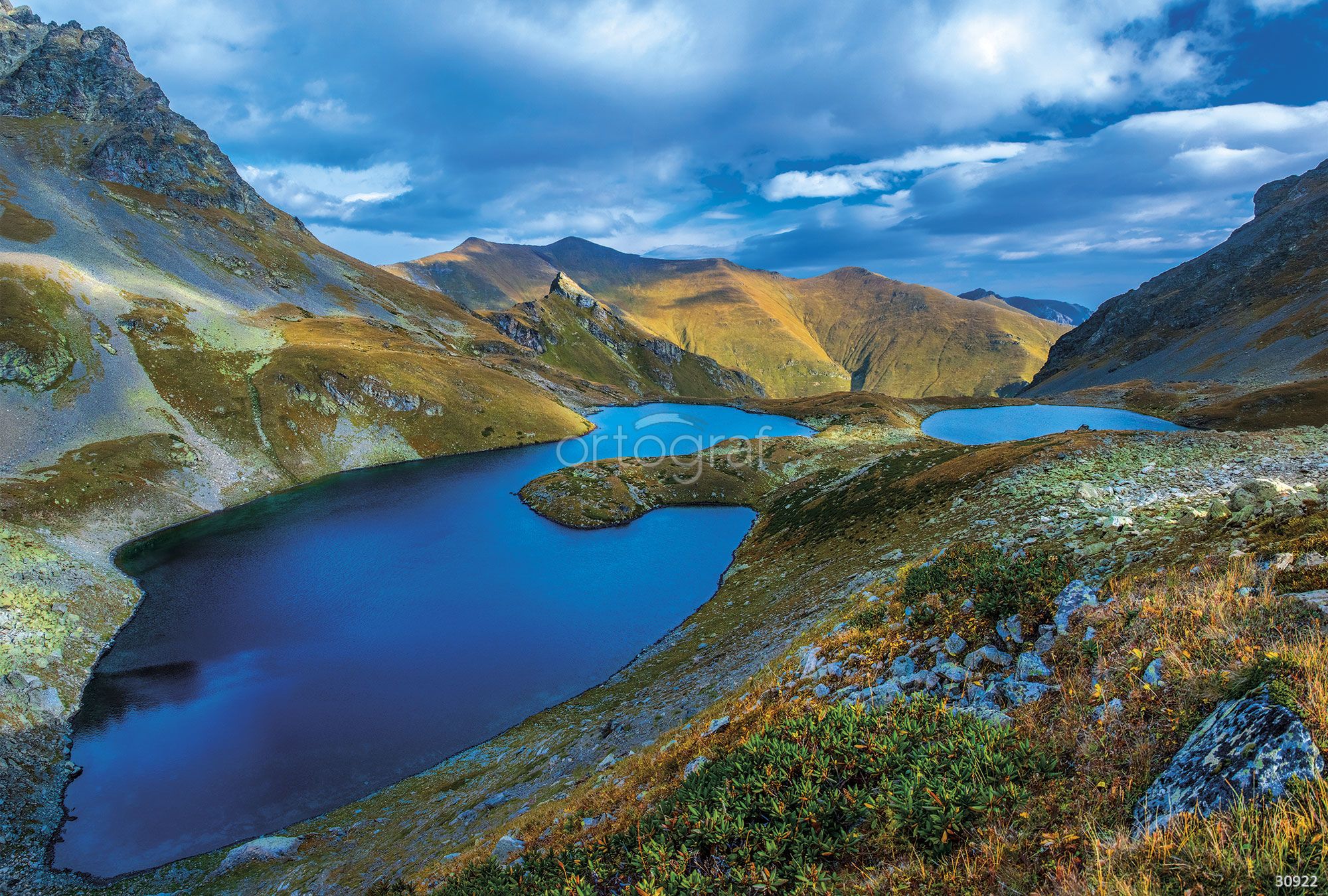 Панорамный пейзаж высокогорья с чистыми голубыми озёрами, окружёнными скалистыми склонами и мягко освещёнными вершинами, создаёт ощущение прохлады, простора и тишины. Такой сюжет прекрасно подходит для создания акцента на природе и отражения спокойствия в современном интерьере.