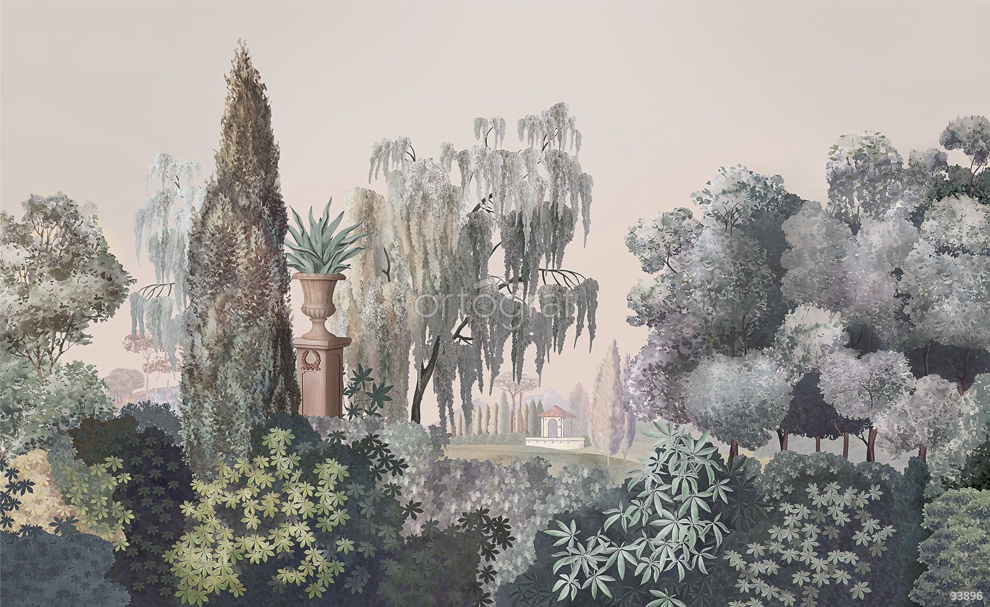 Пейзаж с густыми деревьями, декоративной вазой и небольшой архитектурной постройкой на фоне создает атмосферу уединённого сада или исторического парка. Такой сюжет придает интерьеру ощущение природной гармонии и простора, наполняя комнату спокойствием и романтикой. Отлично подойдет для оформления уютного уголка, гостиной или спальни.