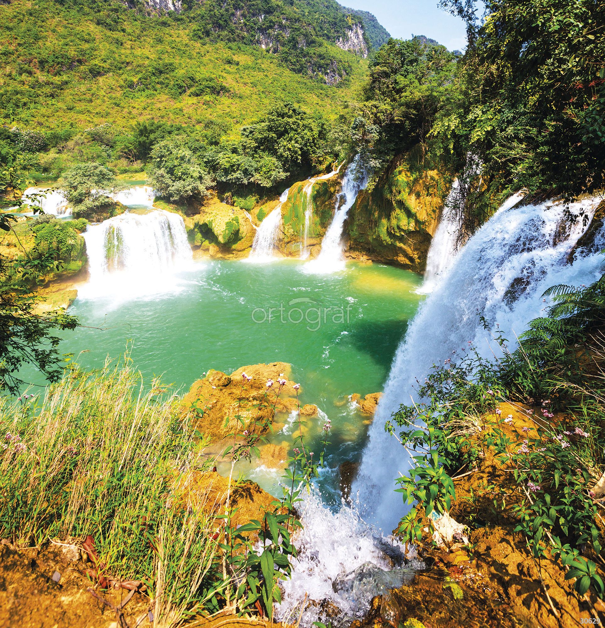 Впечатляющий природный пейзаж с несколькими мощными водопадами, падающими в бирюзовую воду на фоне зелёных склонов и скал. Сюжет наполняет помещение ощущением свежести, динамики и природной энергии, отлично помогает создать атмосферу отдыха и уединения с природой. Такой рисунок великолепно подчеркнёт экостиль и добавит в интерьер гармонию.