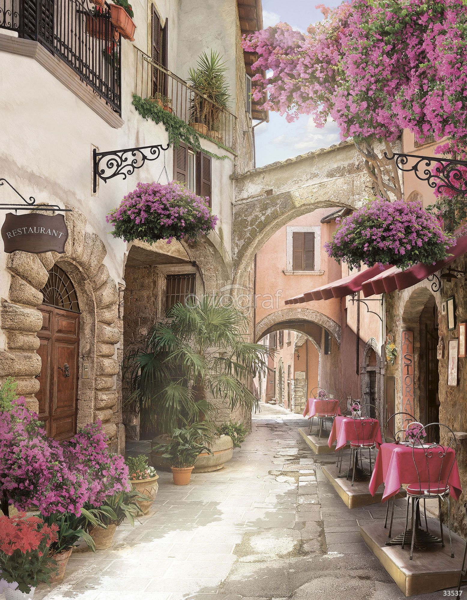 Уютная улочка с рестораном, верандами и множеством цветущих растений погружает в атмосферу европейского городка. Такой сюжет наполняет помещение романтикой, расслаблением и ощущением летнего отдыха. Отлично подойдет для создания тёплого, гостеприимного интерьера.