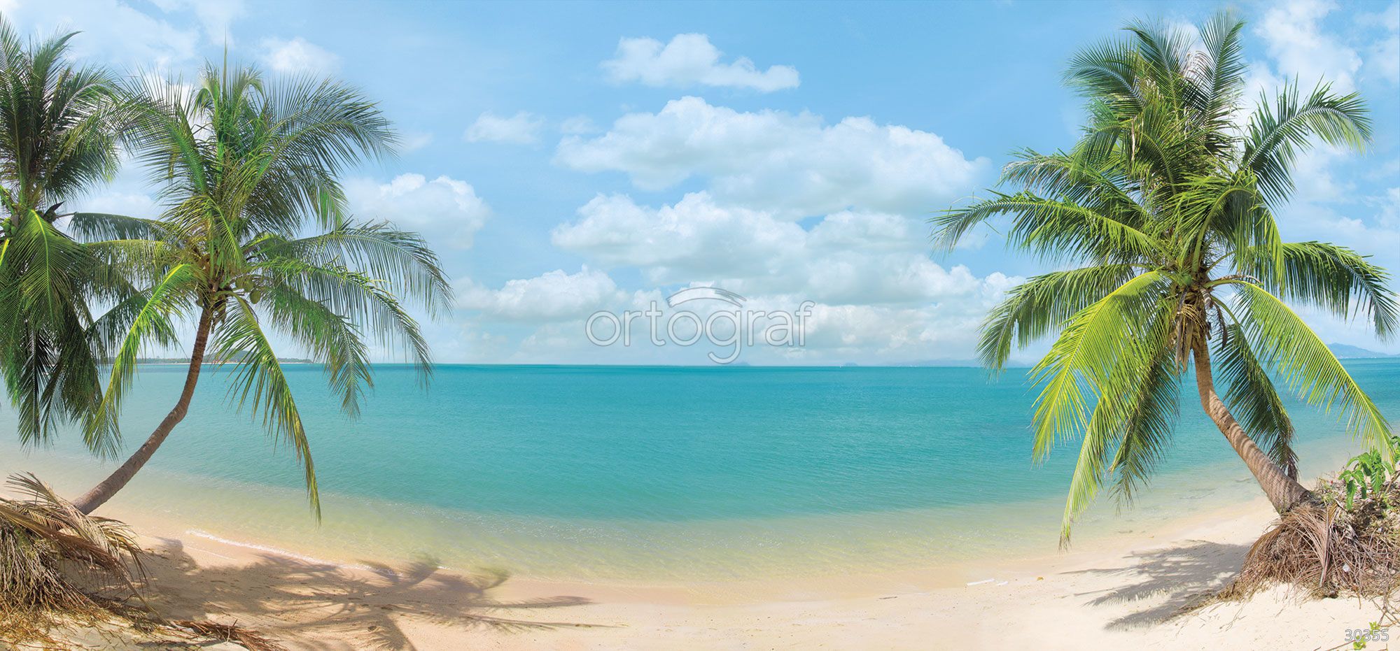 На изображении изображён тропический пляж с мелким золотистым песком, прозрачным бирюзовым морем и двумя изогнутыми пальмами, расположенными по бокам композиции. Небо ярко-голубое с белыми облаками, вода спокойная, а общий пейзаж создаёт атмосферу уюта и райского летнего отдыха.