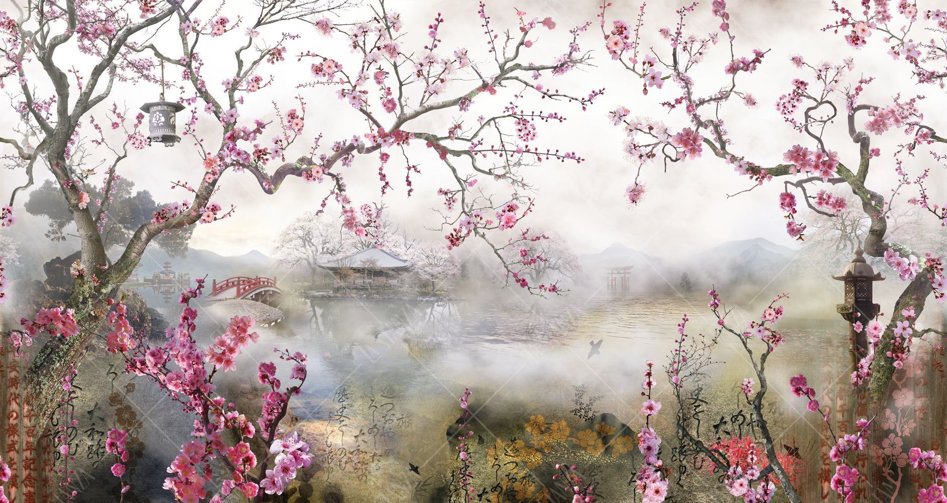 Фреска Ветки дерева сакуры на фоне японского сада