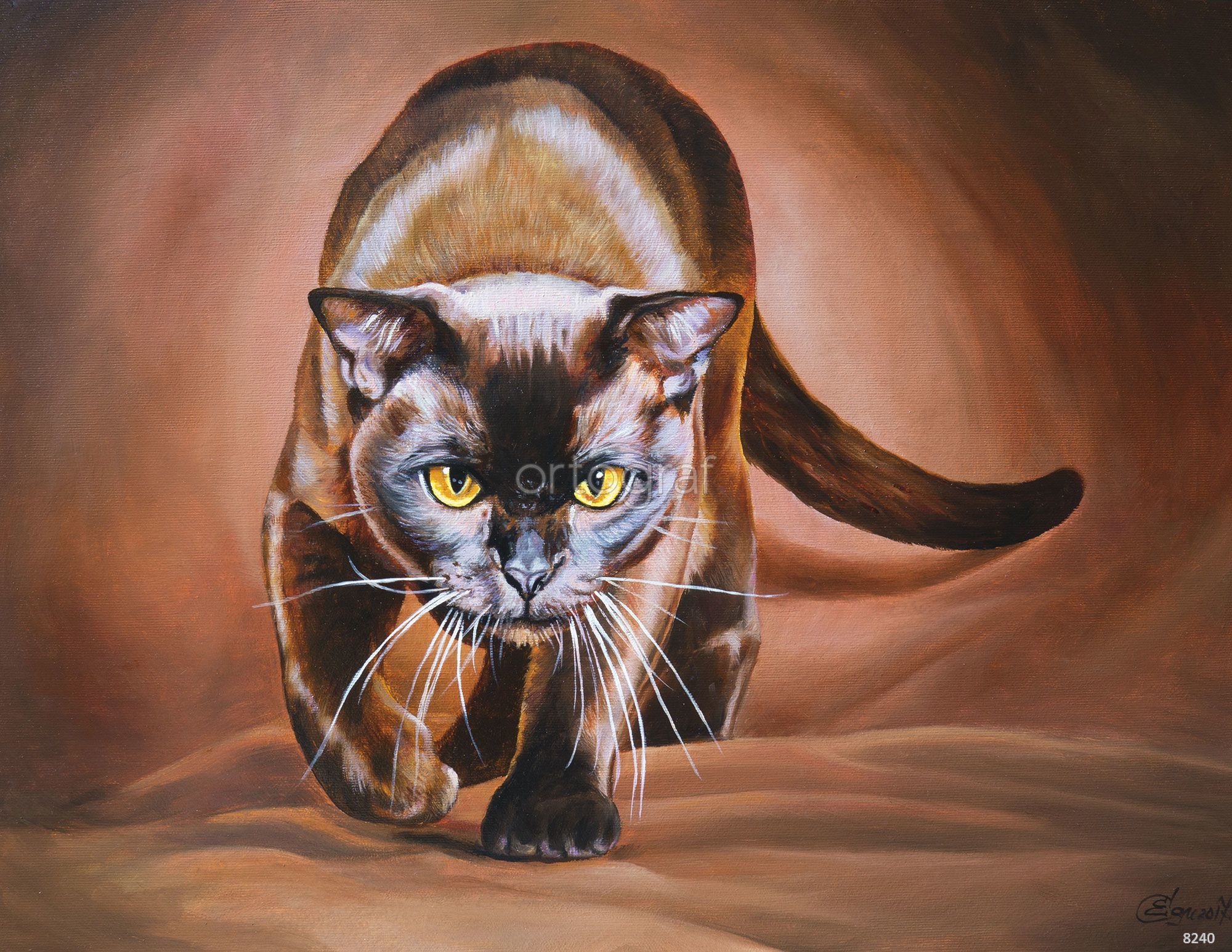 Картина изображает реалистичного кошку, которая движется вперед с настороженным взглядом Динамика изображения придаёт ему выразительность и создаёт ощущение движения, а внимательный взгляд привлекает внимание к центру композиции Такой рисунок прекрасно подойдёт для оформления гостиной, офиса или прихожей и коридора, где может стать центром внимания или подчеркнуть стиль помещения
