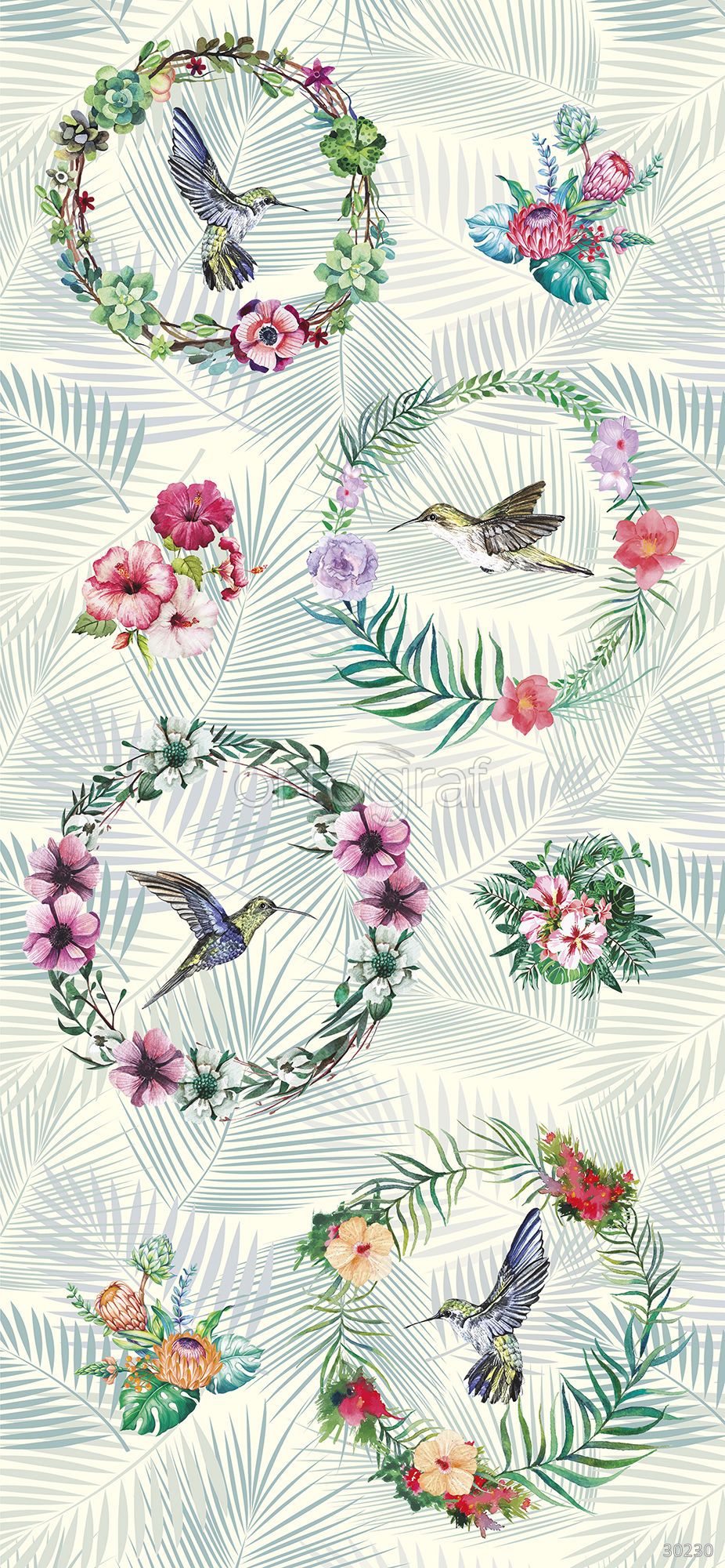 На изображении представлен декоративный тропический паттерн с венками из листьев, экзотических цветов и колибри. Каждый венок украшен композициями из тропических растений и ярких цветов, а внутри некоторых расположены летящие или парящие птицы. Общая атмосфера создаёт ощущение природной пышности и элегантности, тропиков и летнего настроения.