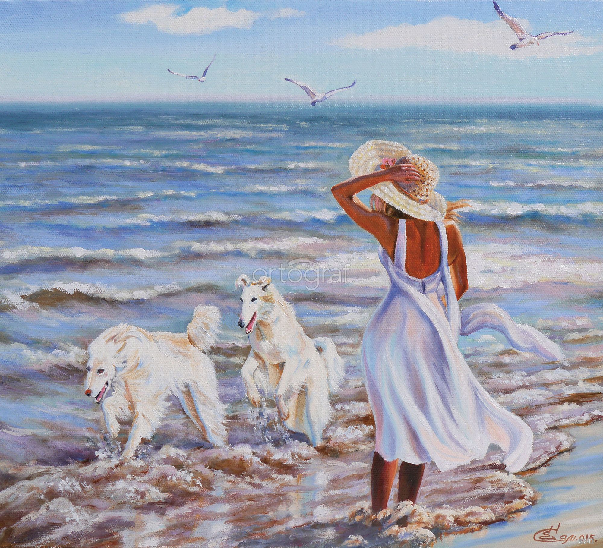 На картине изображена девушка в воздушном платье и шляпе, стоящая на берегу моря, рядом с ней играют две собаки Лёгкость сцены, морская волна и парящие чайки создают атмосферу отдыха и свободы, такой сюжет идеально подойдёт для создания уюта и спокойствия Лучше всего рисунок впишется в интерьер гостиной, спальни или столовой, добавив нотки свежести и расслабленности