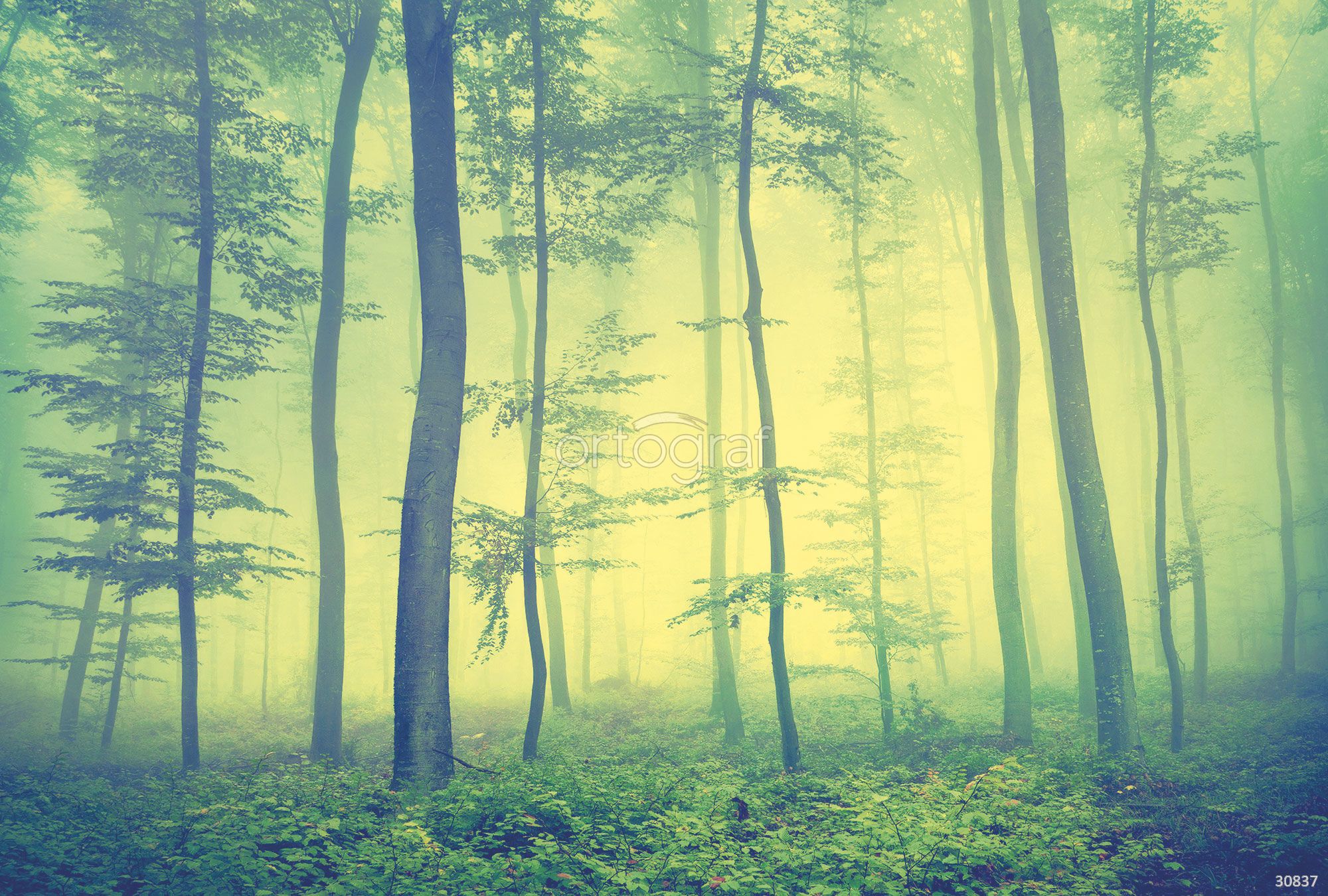 Лесная сцена с высоким подлеском и туманом, мягко рассеивающим свет, создает ощущение уединения, свежести и спокойствия. Такой сюжет наполняет помещение природным светом, гармонией и визуально увеличивает пространство.