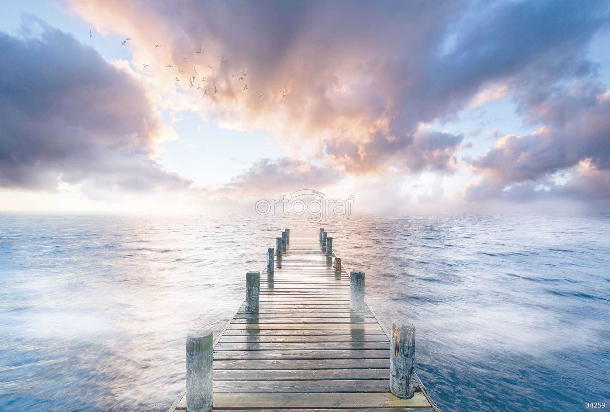 Пейзаж с деревянным причалом, уходящим вдаль на фоне моря и ярких облаков, создает эффект глубины, свободы и спокойствия, визуально открывая пространство. Такой сюжет отлично впишется в гостиную, спальню или коридор, где хочется добавить ощущение отдыха, вдохновения и лёгкости. Натуральные мотивы и динамичные облака придадут интерьеру современный и свежий вид.